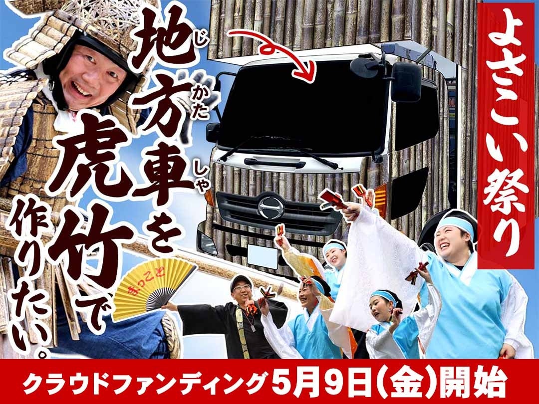 地方車は、よさこいチームの一つの見せ場であり、4tトラックを使っての製作ですので、例年高額な費用がかかっていますが、虎竹で製作するとなると更に費用がかさむ事が予想されています。そこで、クラウドファンディングを実施し全国のよさこい祭りファンはじめ、多くの方にご支援いただけないかと考えています。ご支援いただきました皆様へのリターンは、金額に応じて多彩にご用意いたしております。よさこい祭り本番にて、追手筋本部競演場で製作した虎竹地方車の煽り席や運転席に乗り込めるチケット等、よさこい祭り聖地ならではの今年だけの超レアなリターンはファンの方には見逃せません。