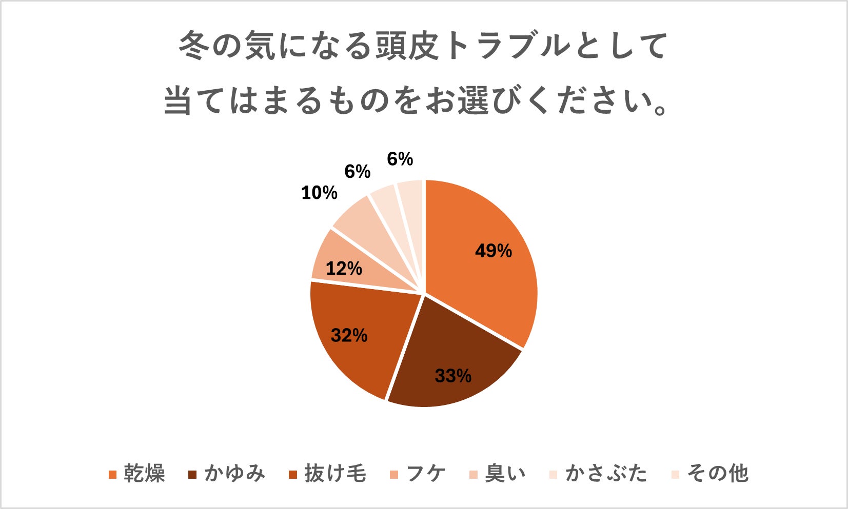 冬の気になる頭皮トラブルとしては、「乾燥」「かゆみ」、そして「抜け毛」に悩む人が多いことがわかりました。また、「フケ」という回答も多くみられます。乾燥や頭皮のかゆみが増すと、フケに繋がる可能性があるので、今後は頭皮のフケにも注意が必要です。