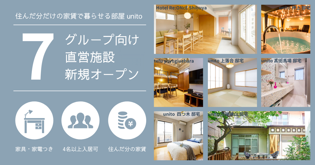 住んだ分だけの家賃で暮らせる部屋「unito」を提供する株式会社Unito(東京都千代田区、代表取締役:近藤佑太朗、以下ユニット)は、ユニットが直営する施設を新たに、7施設オープンをいたします。