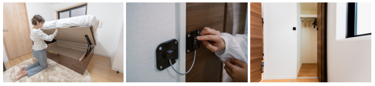 入居者が荷物を置いたまま出かけられるように、部屋の形に合わせて鍵付きの収納スペースをご用意しております。