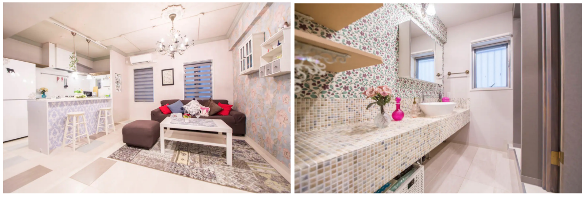 白をベースにガーリーにデザインされた部屋。どこを切り取ってもかわいい壁紙が特徴的です。3ベッドルーム(ダブルベッド1/ダブルベッド1/セミダブルベッド1)の最大5名まで入居可能。家具家電付きのため、引っ越し時の初期費用を抑えられます。