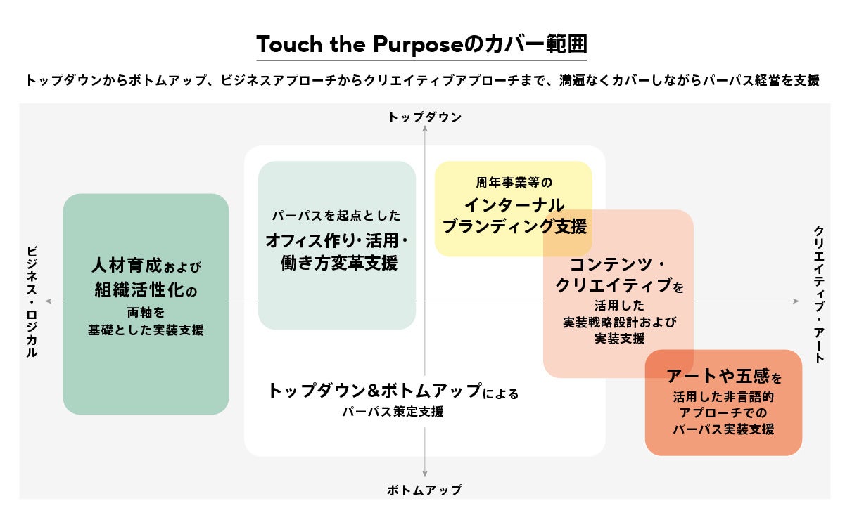 トップダウンでの発信が主流であるパーパス経営に、ボトムアップ起点のアプローチを加えることで、社内への浸透や実装の度合いを高めていきます。また、アートや五感を活用した非言語的アプローチを用いて、言語では表しづらい社員一人ひとりのインサイト(潜在意識)も顕在化します。これらのアプローチを組み合わせて、確かな企業変革の実現を目指します。