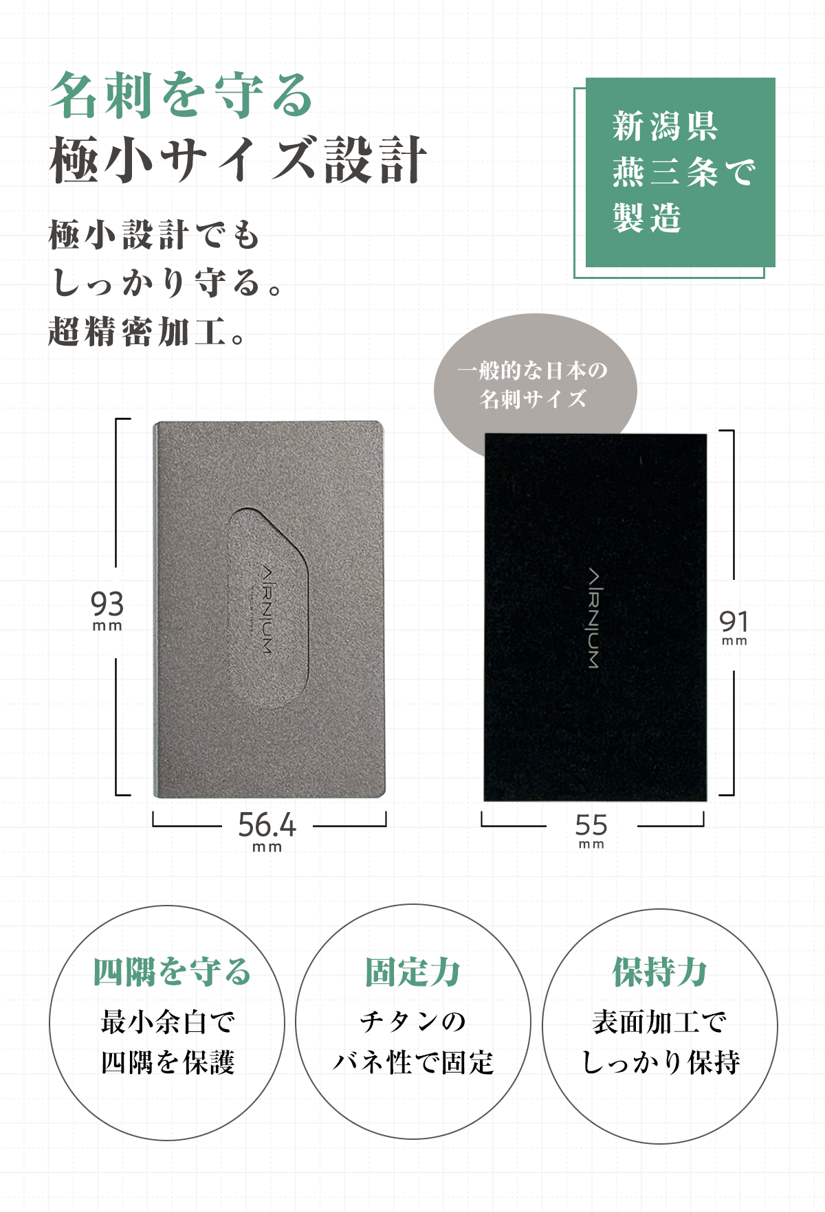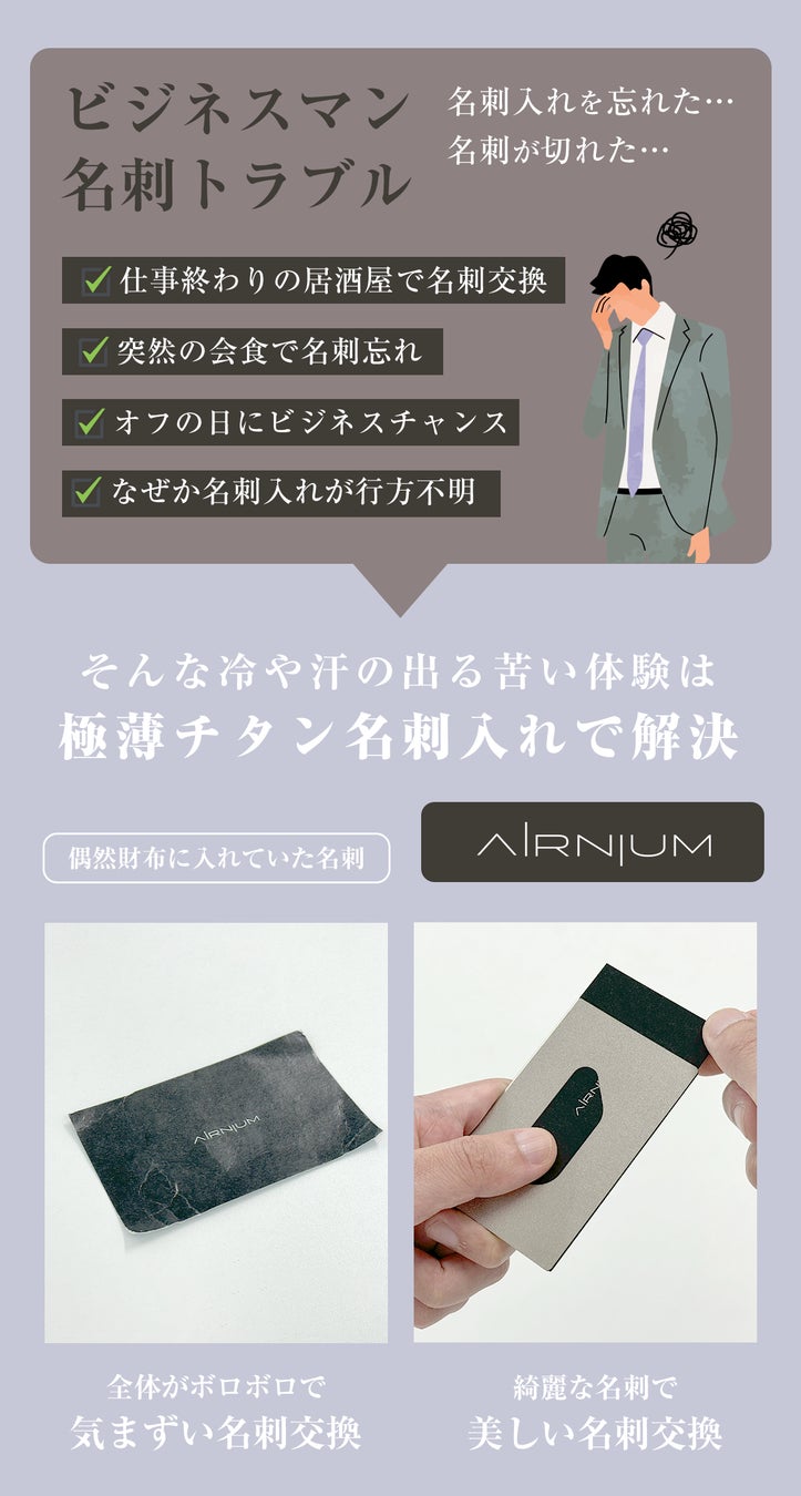 指で名刺の角を伸ばし、汚れをこすり取ろうとしながらこんなセリフを言う経験はもう必要ありません。財布に忍ぶ、極薄チタン製名刺入れAIRNIUMは、働く人すべての方の第一印象に関わるお悩み事を解決し「新しい出会いをより素敵なものに」する、ビジネスマンの為のメタルガジェットです。