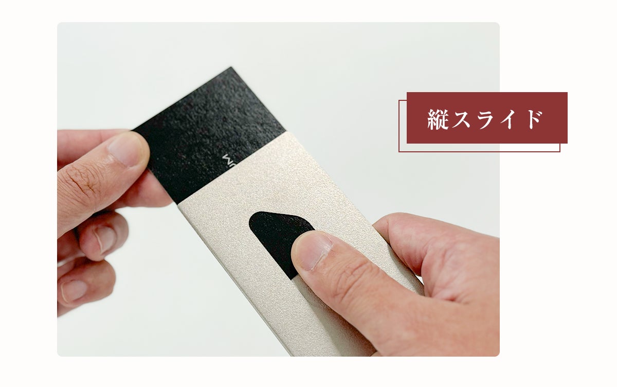 その薄く小さなサイズ感とデザインだけでなく、予備の名刺入れでありながら、名刺交換の美しい所作や使用感に対しても一切妥協はありません。スライド機構によりワンアクションで名刺を露出、もたつくことなくスムーズな動作でスマートに名刺を取り出すことができます。先方から頂いた名刺の枕にはもちろん、名刺交換時の枕としても活躍。礼を失することはありません。