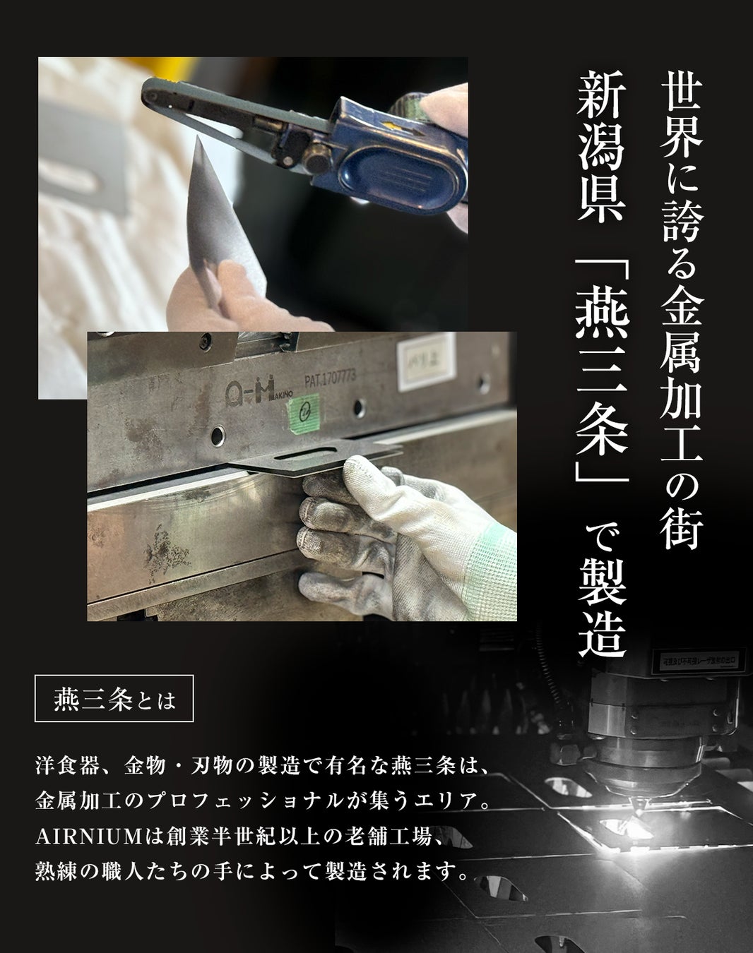 燕三条の職人により仕上げられる「AIRNIUM本体の造形美」だけでなく、実はパッケージも燕三条の紙器会社様にて高級感のある素敵なモノへ仕上げていただいております。ご自身のビジネスライフをより豊かにしたい方はもちろん、高品質かつ高級感あふれるAIRNIUMは、働くすべての方へのプレゼントとしても最適です。