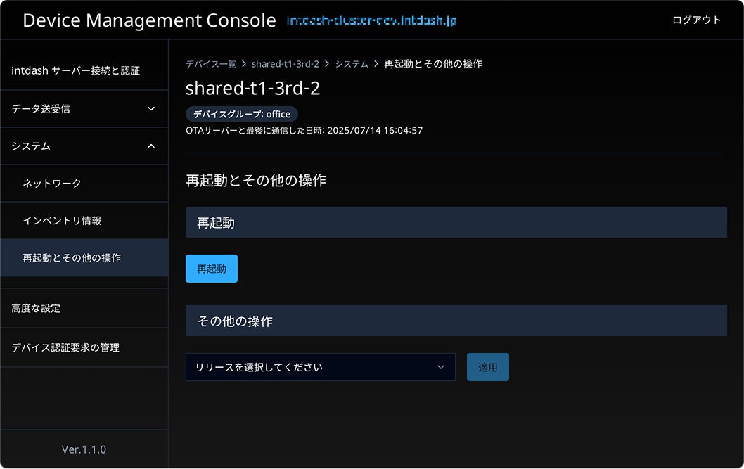 intdashのエッジソフトウェアである「intdash Terminal System 2」ではOTA (Over the Air)によるデバイスソフトウェアの管理・アップデートが可能です。遠隔での、