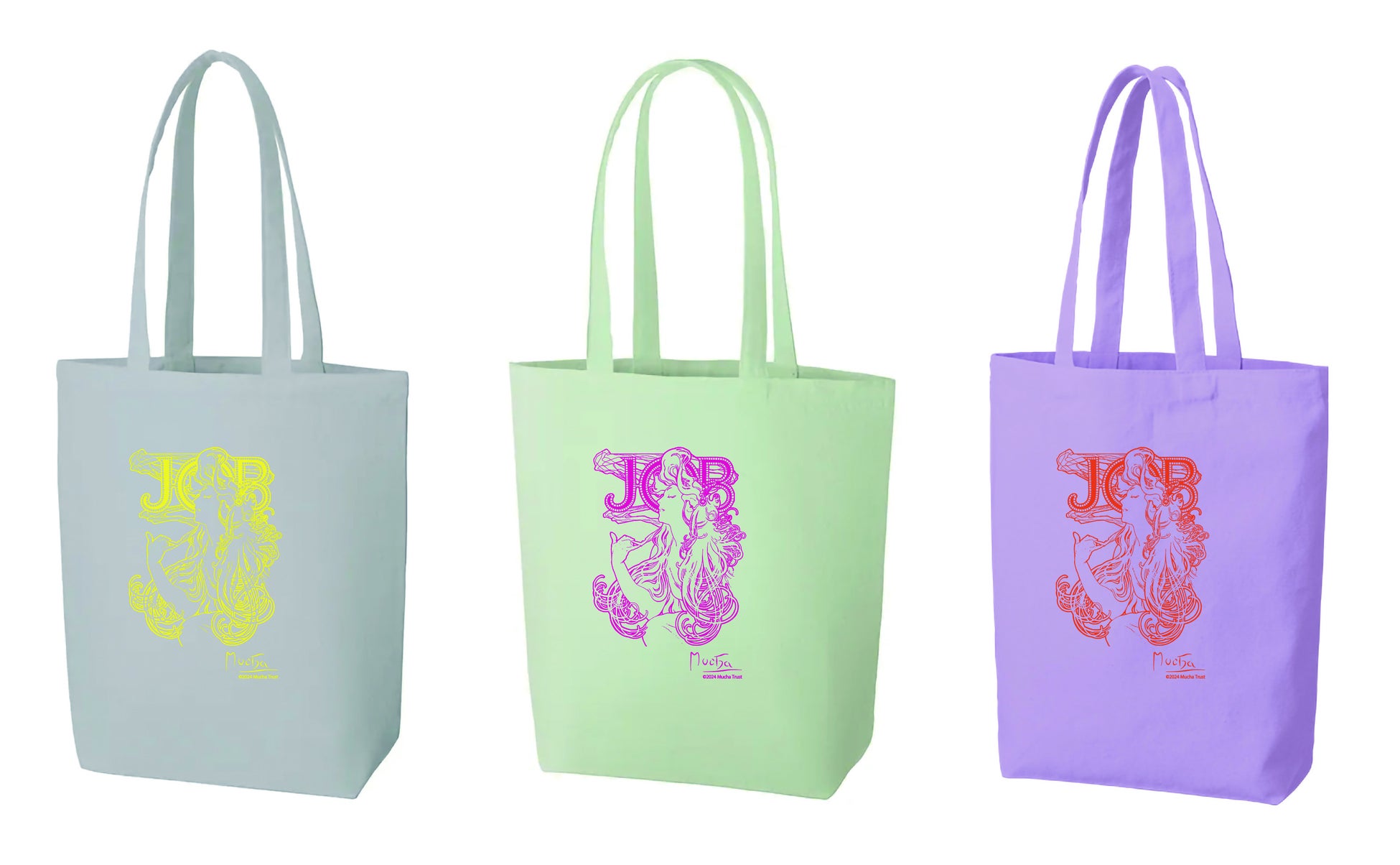 ミュシャの人気作品《ジョブ》がデザインされた、A4サイズもすっぽり入るキャンバス地トートバッグ。 「スカイグレー」「オリーブ」「パープル」の3色展開で、ファッションの差し色としても大活躍♪