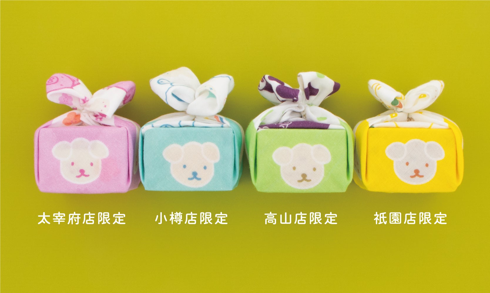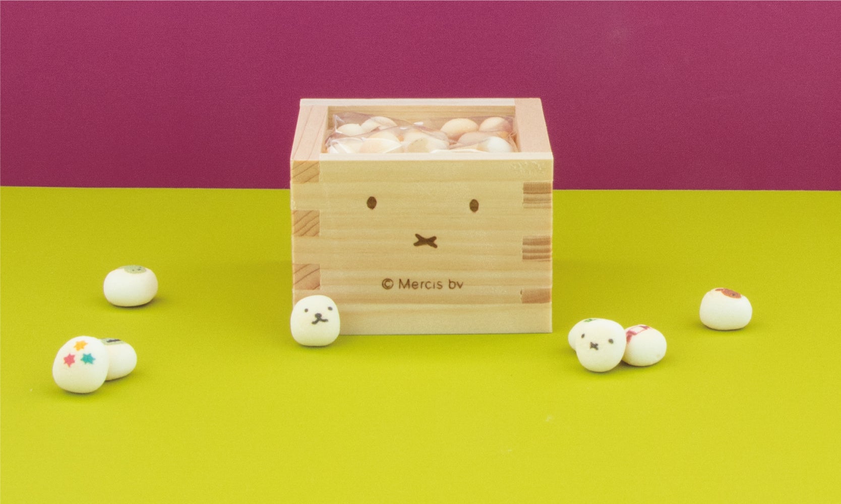 ちょうちょのように括(くく)られたはんかちを開くと、ミッフィーの焼き印が付いたひのきの枡が現われます。そしてその枡の中には、ひとつぶ一粒にプリントがほどこされたおいしいたまごボーロが。ボーロを食べ終わったあとも可愛く残る、和雑貨とミッフィーを組み合わせた和みの一品です。みっふぃーおやつ堂各店にて、”そのお店でしか買えない”オリジナルデザインが新登場!