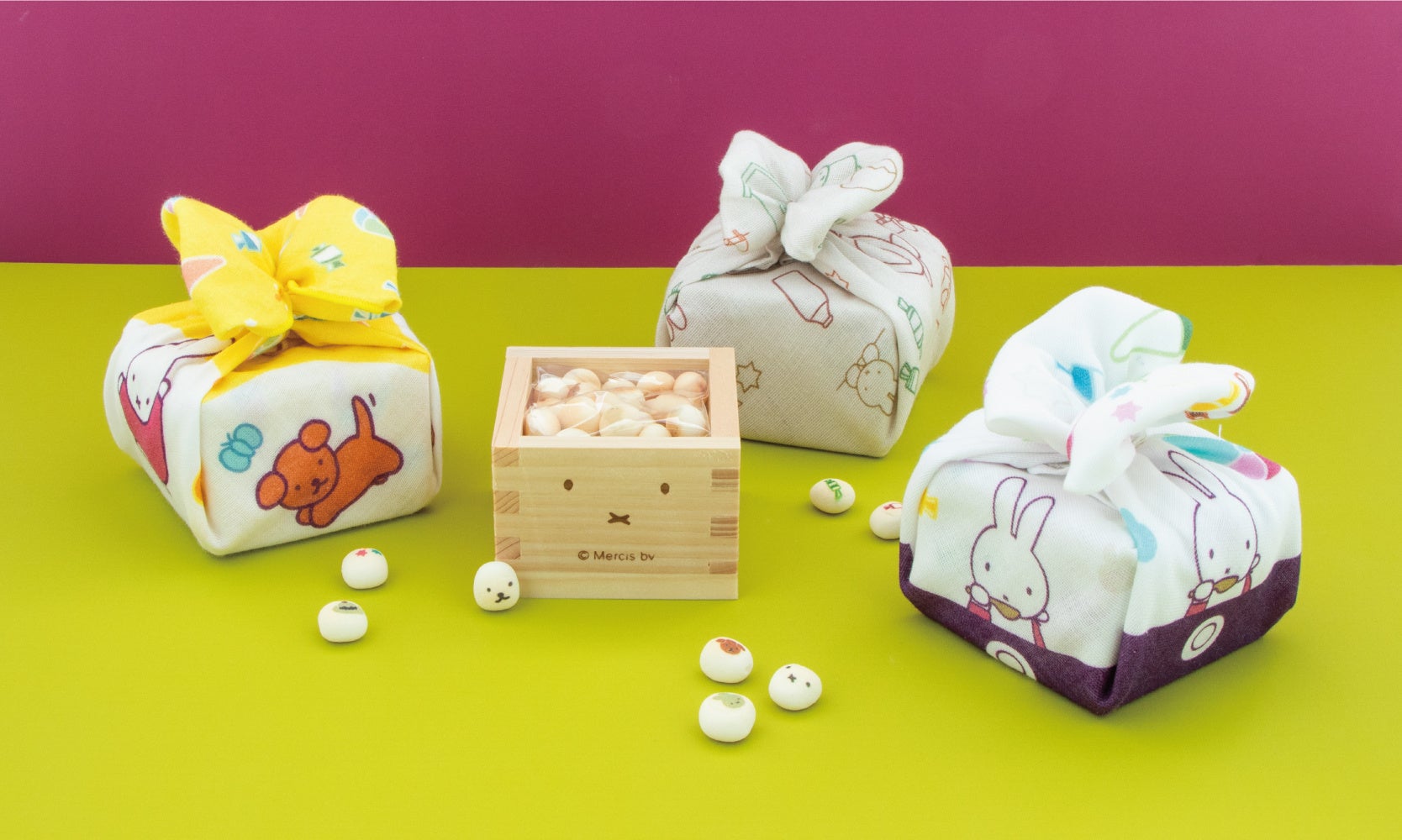 リボンのような、ちょうちょのような、ふんわりとした包み方が特徴のはんかち枡ぼうろは、プチギフトにもおすすめです。はんかちのそれぞれには、各店舗限定をイメージしたブルーナアニマルが 、デザインされていますので、はんかちを解いたら探してみてくださいね。焼き印のついた枡は、お正月や、節分の時期にもお楽しみいただけます。