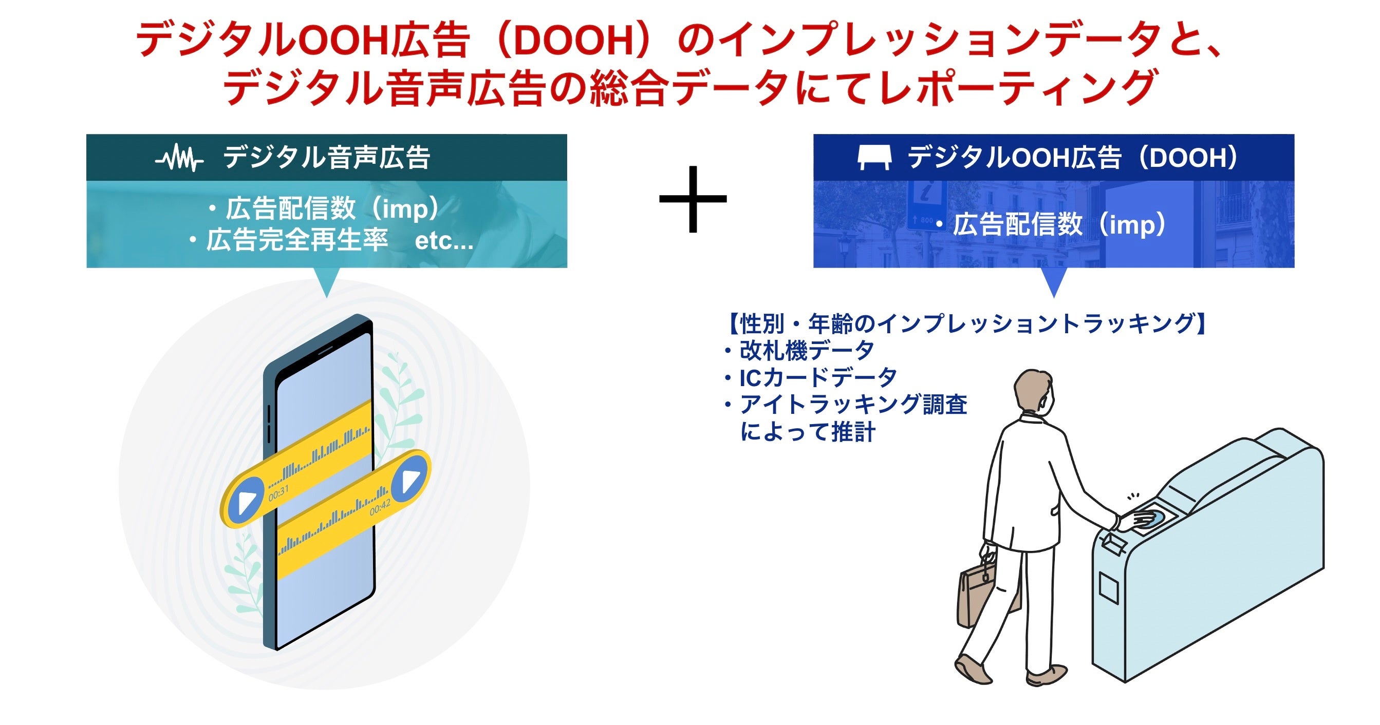 この連携によって、大阪エリアの消費者の行動履歴に応じて交通広告と音声広告を配信できるため、スマホ画面を見ていない状態でも街なかで新たな広告体験を創出します。