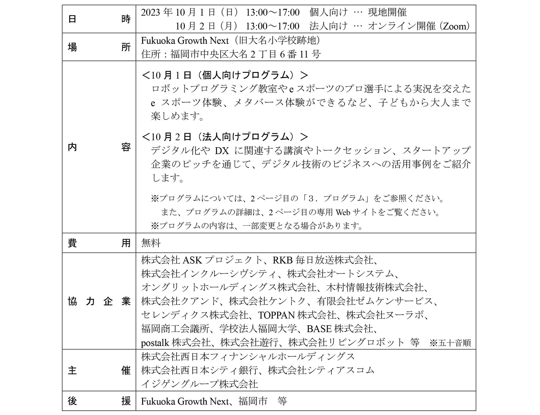 西日本フィナンシャルホールディングス(社長 村上 英之)は、グループ会社である西日本シティ銀行(頭取 村上 英之)と株式会社シティアスコム(社長 藤本 宏文)とイジゲングループ株式会社(社長 鶴岡 英明)との共催により、「デジタルの日※」の10月1日・10月2日に、デジタル体験イベント「FUKUOKA DIGITAL DAYS 2023」(以下「本イベント」)を開催することとし、本日から参加者を募集しますので、お知らせします。