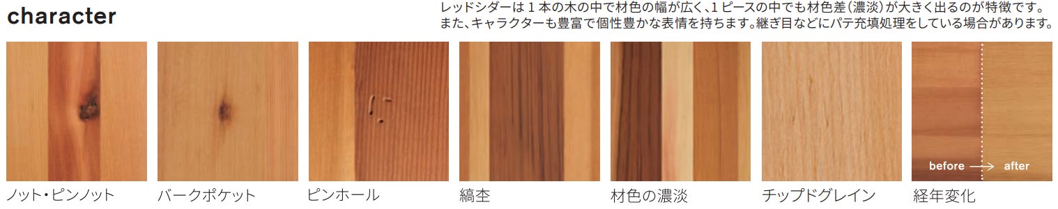 製品表面には厳選したレッドシダー突き板を採用。レッドシダーならではの濃淡の差や、ノット・ピンノットなどのキャラクターをバランスよく配置することで、本物の木の息づかいを感じて頂けます。