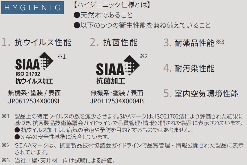 SIAA基準の抗ウイルス性能と抗菌性能、耐薬品性能、耐汚染性能、室内空気環境性能という、これからの住まいに求められる5つの衛生性能を備えています。
