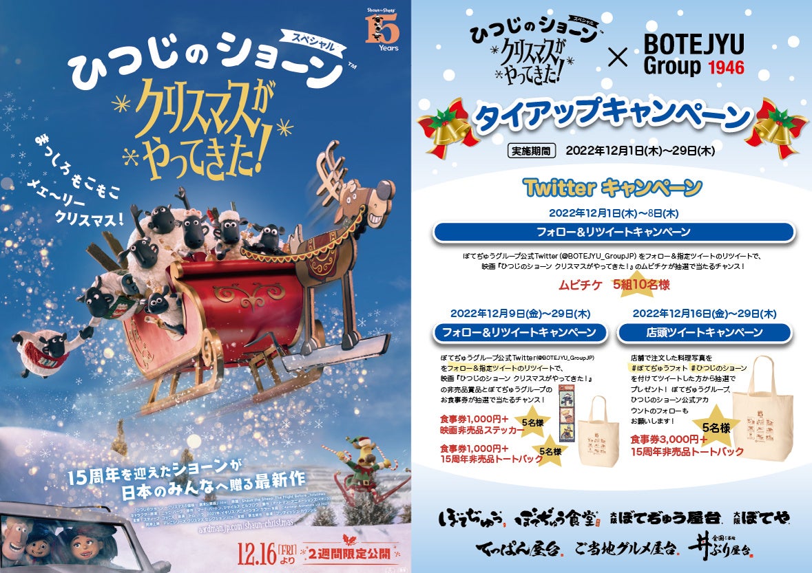 「ぼてぢゅう ®」を運営する「ぼてぢゅう® グループ」(大阪府大阪市、代表取締役社長:栗田英人、以下「当社」)は、このたび映画『ひつじのショーン スペシャル クリスマスがやってきた!』とタイアップし、映画公開に合わせ2022年12月1日(木)から2022年12月29日(木)にかけて5種のキャンペーンを開催いたします。