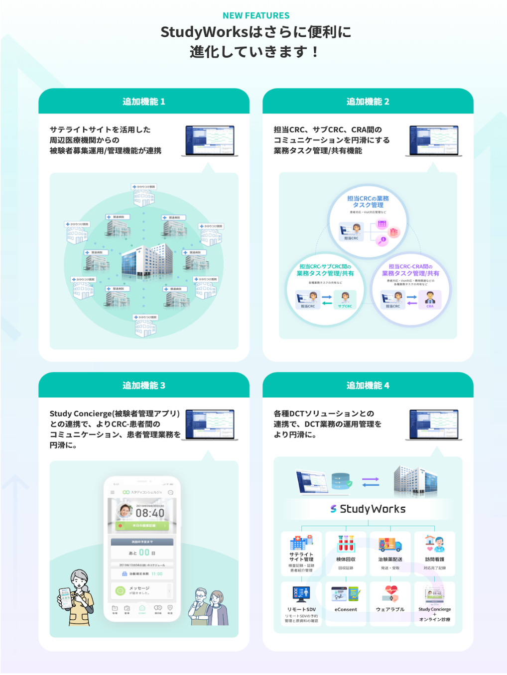 そして、重要な患者エントリーの支援においては、Study Works内のオプション機能で地域住民、周辺医療機関/医師への治験情報共有、関連病院(紹介専門のサテライトサイト)等からの患者紹介管理が可能なため、患者登録の促進にも大きく寄与します。