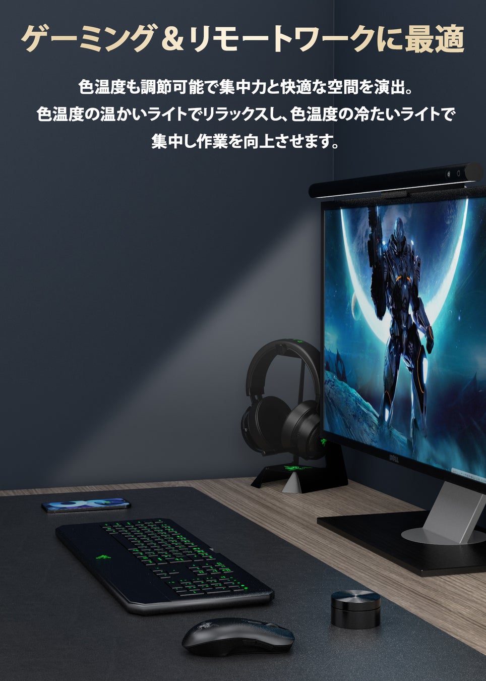 リモートワークで、自宅でのPC業務が多く集中したい方。もしくは、ゲーミングで集中したい方など様々な使用用途で活躍すること間違いなし。このライトがあれば徹夜で残業しても大丈夫で目に優しい照明とより効率的な仕事を楽しみましょう!