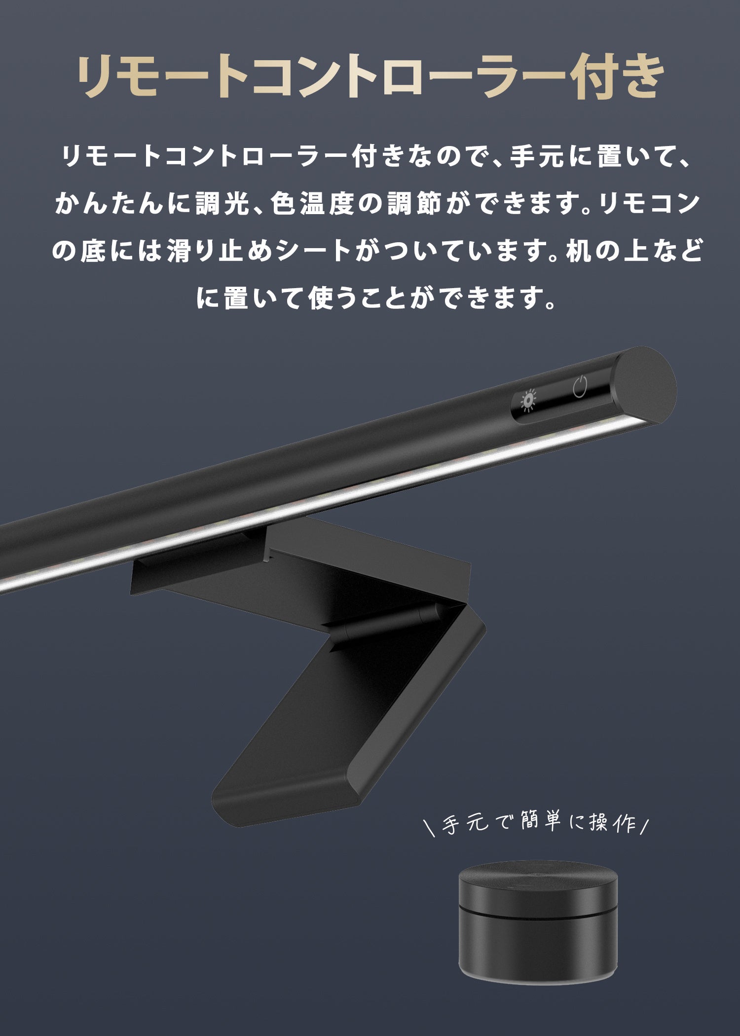 リモートコントローラー付きなので、手元に置いて、かんたんに調光、色温度の調節ができます。リモコンの底には滑り止めシートがついています。机の上などに置いて使うことができます。