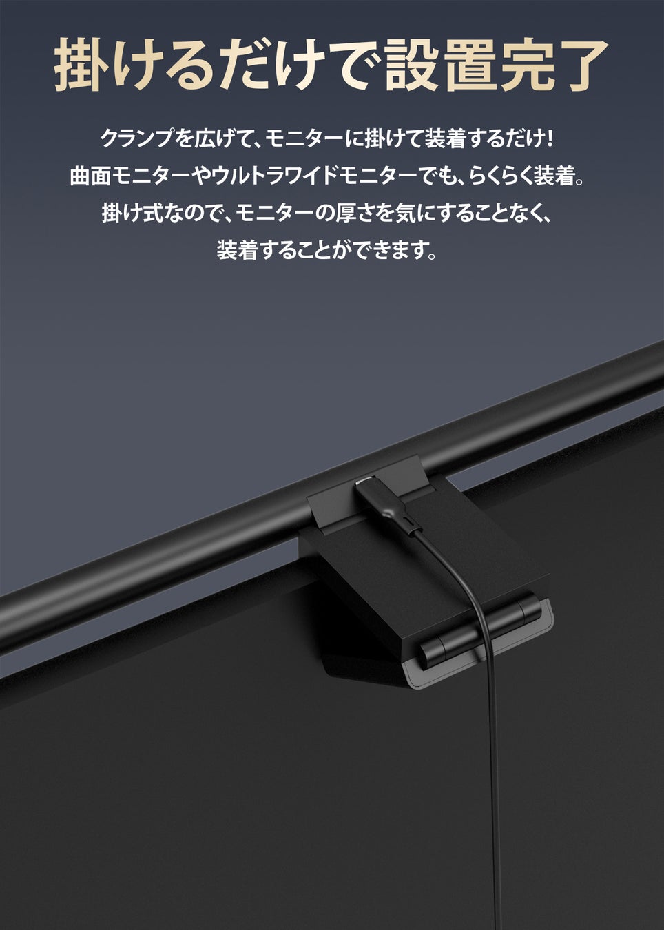 省スペースかつスマートなデザイン。掛け式なので、クランプを広げて、モニターの上にひっかけるだけでらくらく設置ができます。どんな形状のモニターにも対応しています。柔らかい光で照らしだすのでモニターに反射することもない、調光・調色機能を備えたLEDライトです。