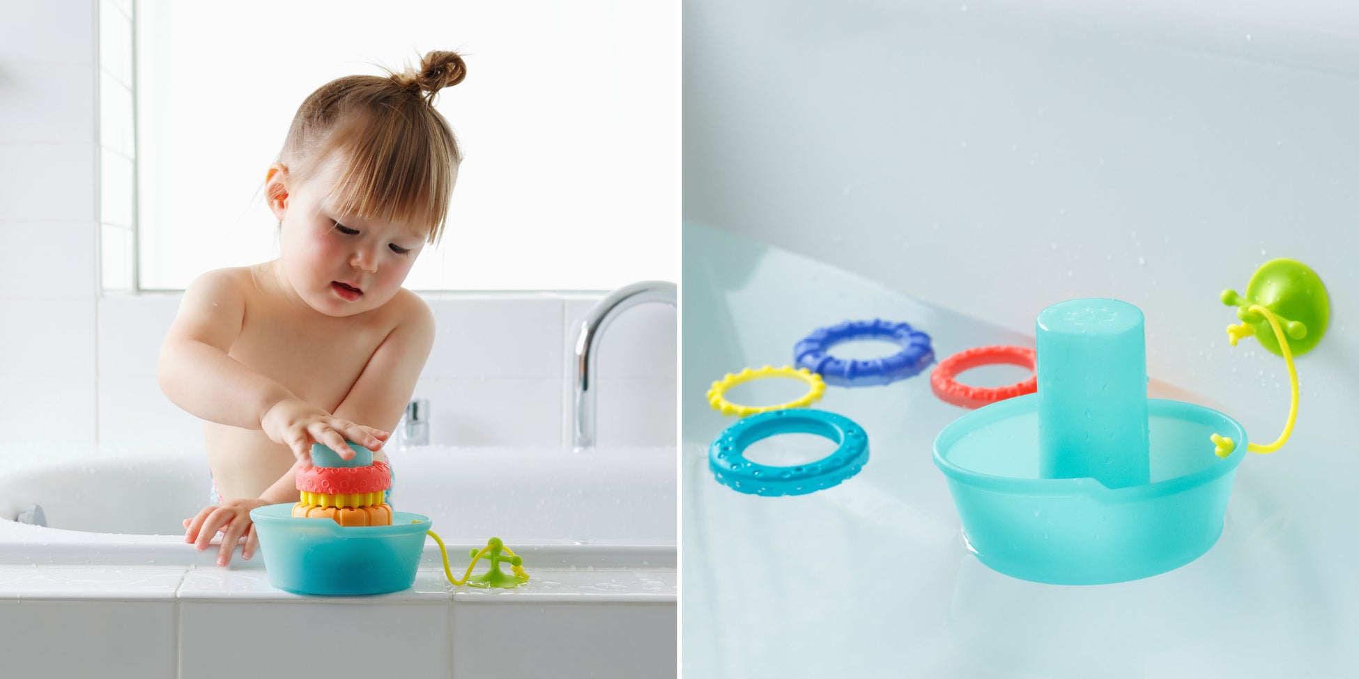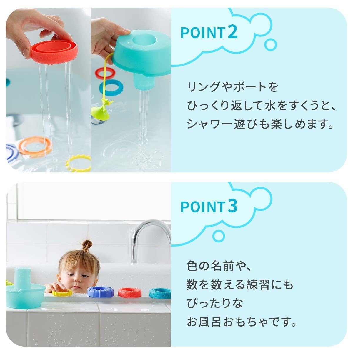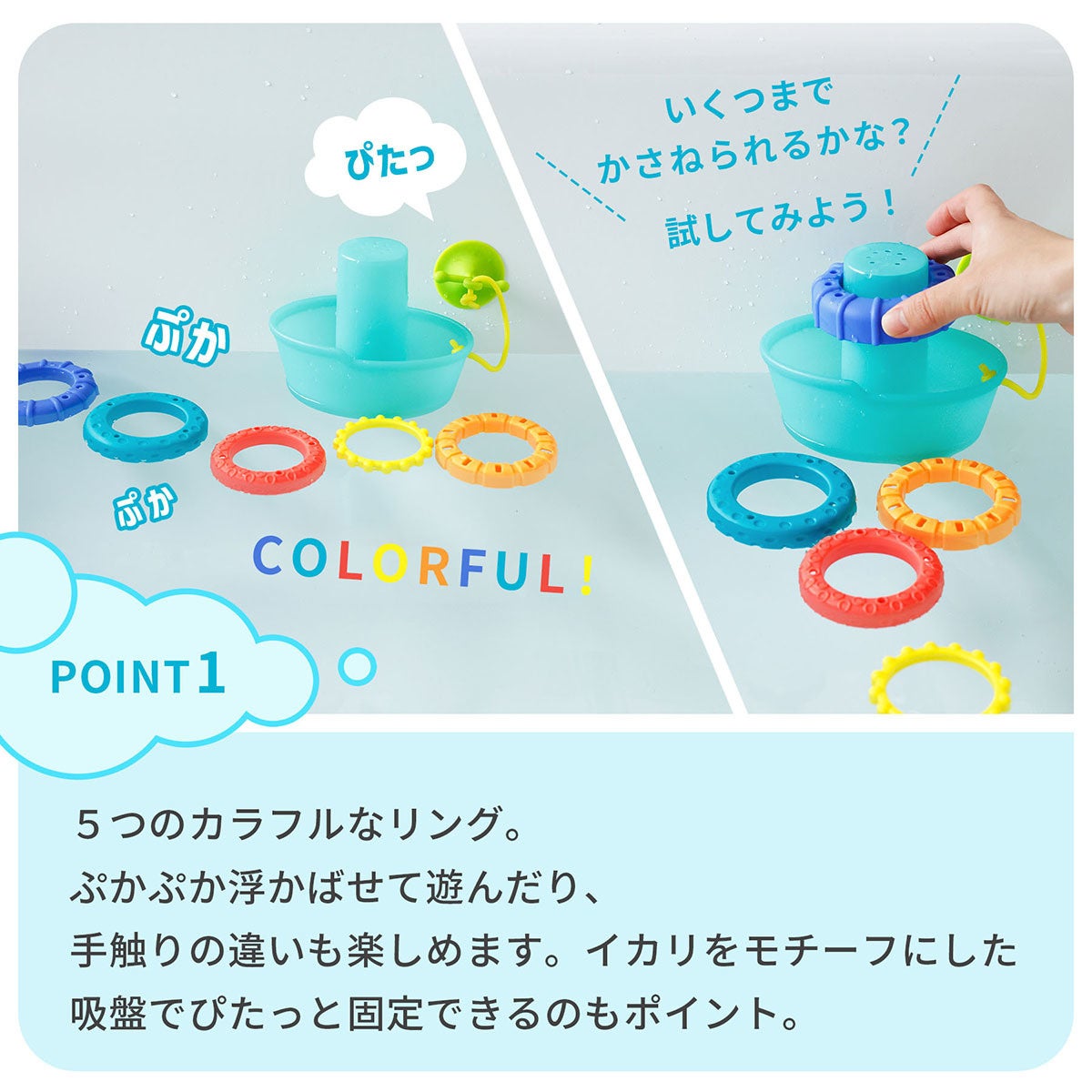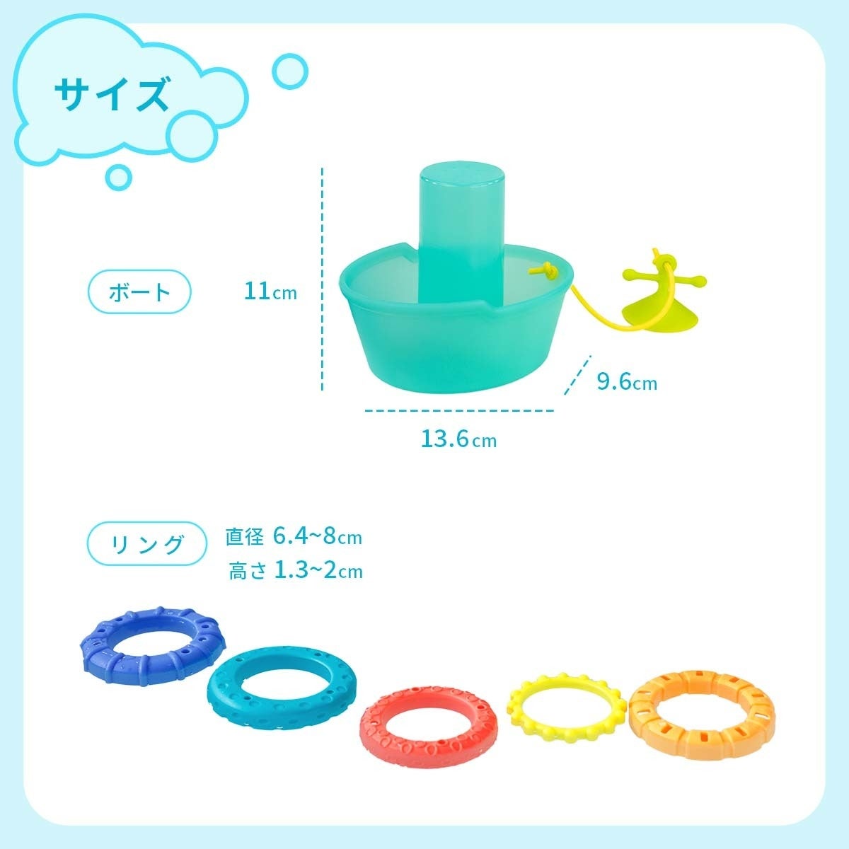 異なる手ざわりのカラフルなリングと、イカリモチーフの吸盤付きボートのセット。リングをボートに重ねたり、ぷかぷかと浮かばせたり。リングとボートはそれぞれシャワーとしても遊べます。