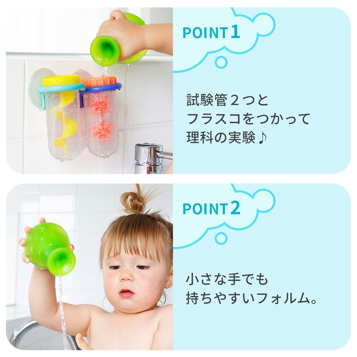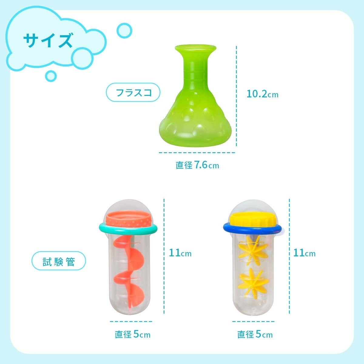 2つの試験管とフラスコのセット。試験管には吸盤がついているので、壁や浴槽にくっつけて遊ぶことができます。しかけがくるくる回ったり、下の穴から水がちょろちょろ流れたり。理科の実験ごっこをしてみましょう。