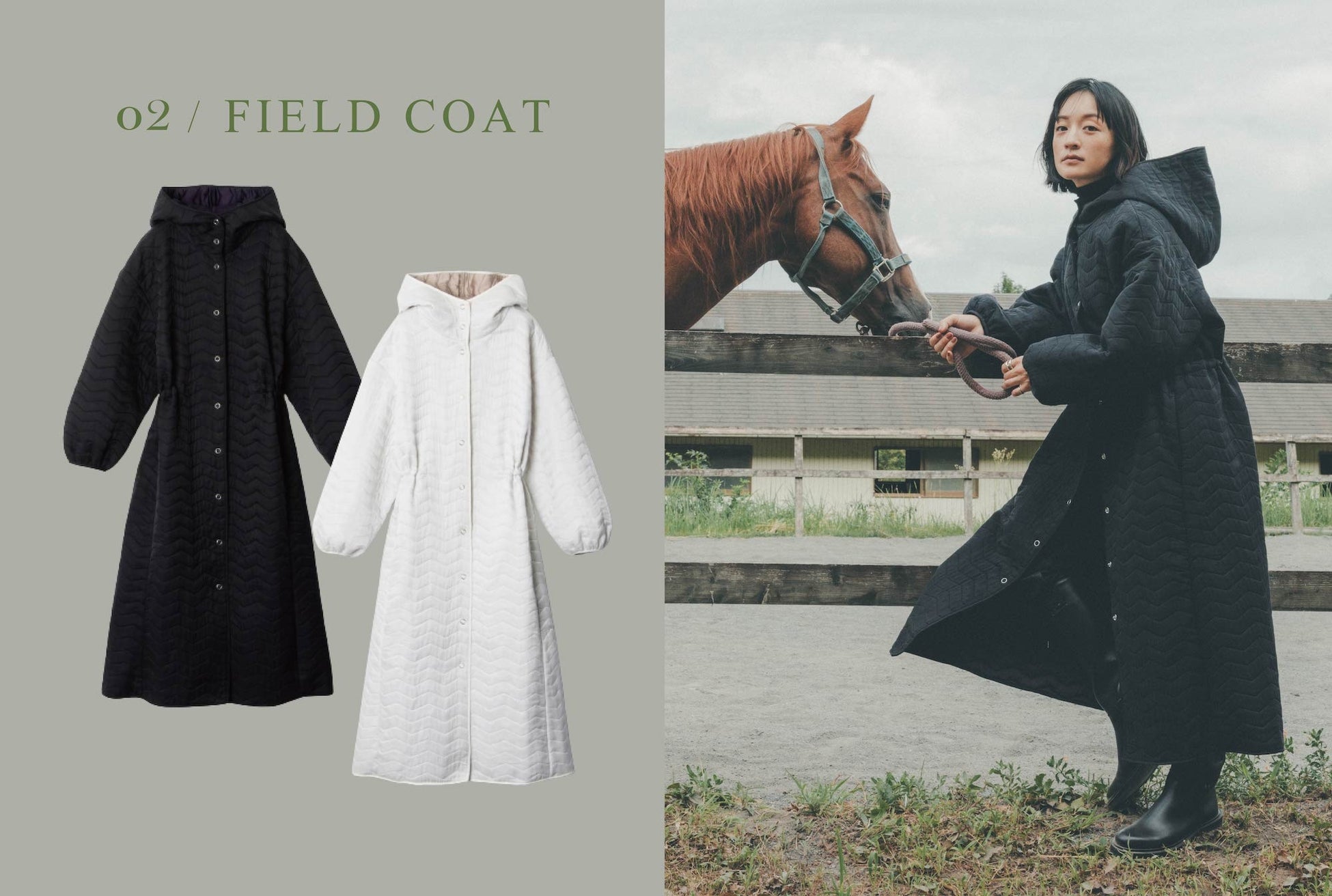“クチュール×アウトドア”を意識した、大人のフィールドコート。エレガントなヘリンボーン柄のキルト刺繍に加え、大きめフードや高めの台襟、バルーン袖など、立体シルエットが特別感を奏でます。