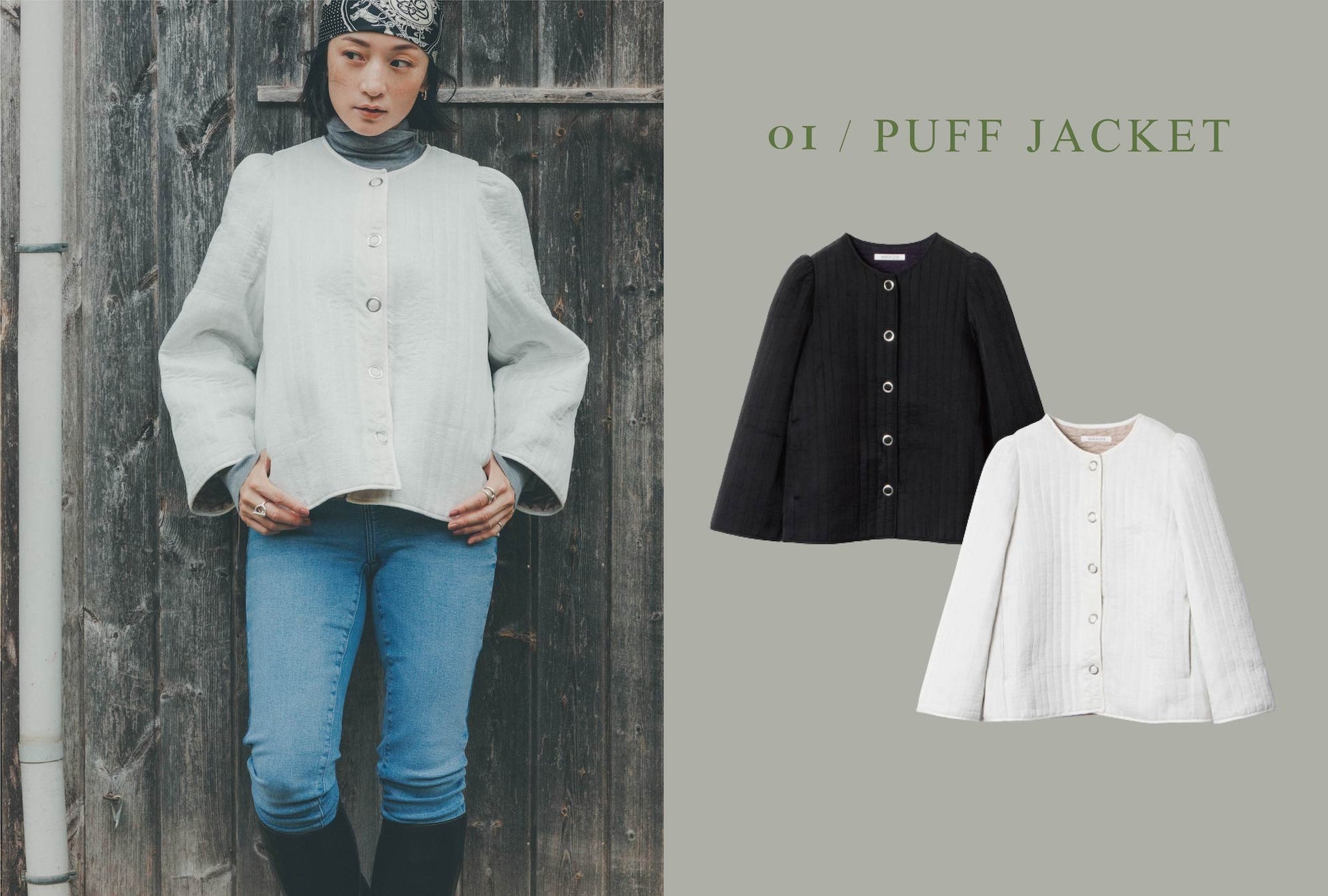キルティングを上品に着たいと願った時、真っ先にデザインが浮かんだジャケット。女性らしいパフスリーブが印象づくよう、全体をコンパクト設計に。ストライプ柄のキルト刺繍でスッキリと、リングドットボタンが甘さをおさえて。