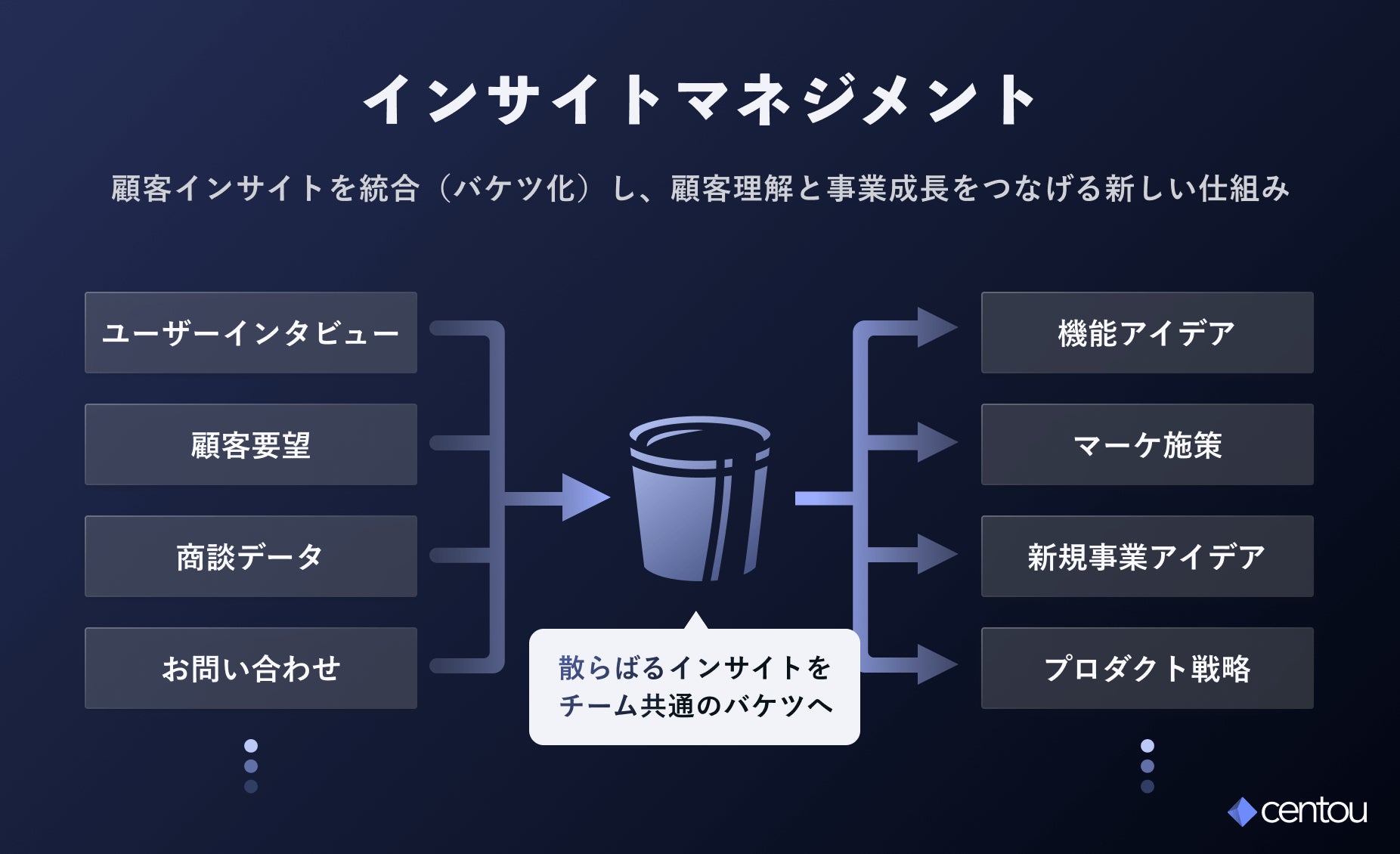 これまで、さまざまなツールや人の中にバラバラに溜まっていた顧客インサイトを統合(バケツ化)し、事業のあらゆる意思決定を顧客インサイト起点で行えるようにするための、新しい仕組みです。