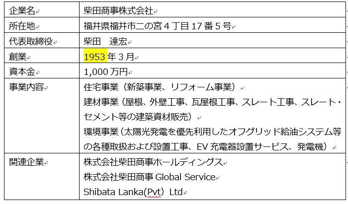 柴田商事は、1953年に福井地震からの復興のタイミングで瓦屋根の専門工事業者として創業し瓦だけにとらわれず様々な屋根材から外壁材、内装材など取扱商品を増やし、施工技術を磨き職人を育成しながら、地元福井を中心に販売を行ってきました。近年では太陽光発電システムの販売施工、不動産事業にも取り組んでおり、特に環境、省エネ商材の普及に力を入れています。これからも、時代の流れと共に様々な事業にチャレンジし、「縁のある全ての人の幸せを目指して」お役に立てる社会貢献に取り組んでいきます。