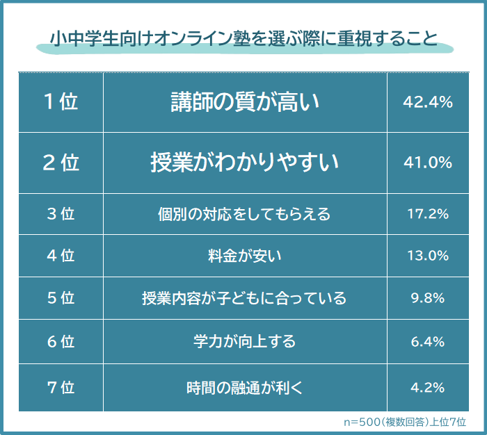 【オンライン塾を選ぶ際に重視することランキング】小中学生の親500人アンケート