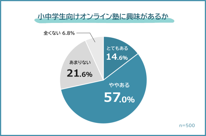 小中学生のお子様がいる500人に「小中学生向けオンライン塾に興味があるか」を聞いたところ、「とてもある(14.6%)」「ややある(57.0%)」と答えた人が、合わせて71.6%でした。