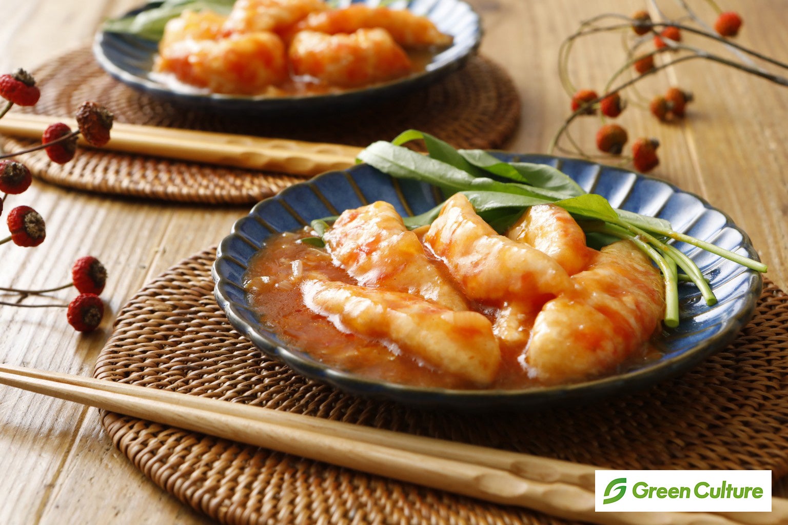 エビのぷりぷり食感と絡まる甘酢がおいしい。大きめのエビ(蒟蒻由来)を贅沢に使いました。本格的な中華の味わい。