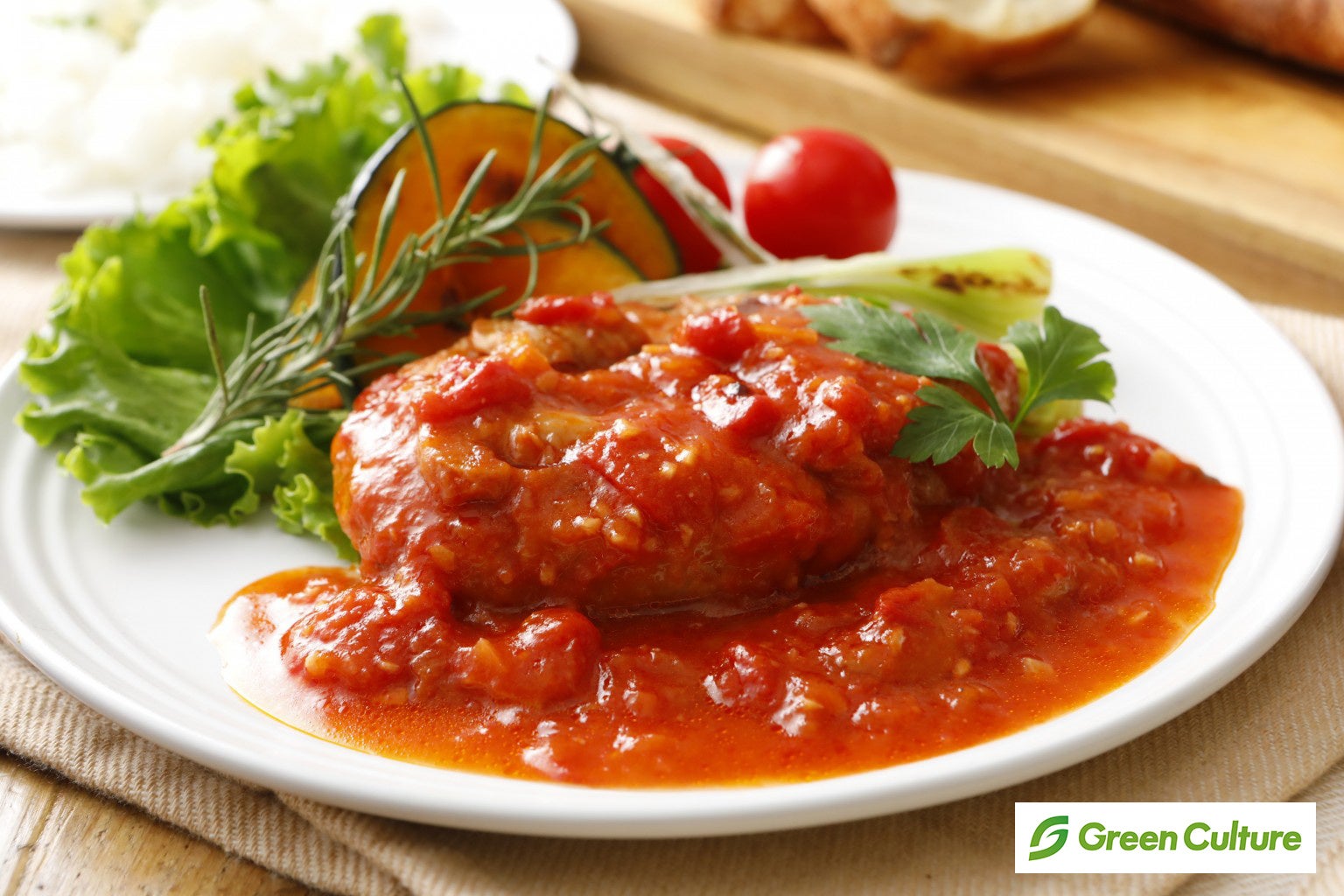 トマトソースでコトコト煮込んだ、ふっくらおいしいハンバーグ。新鮮なトマトやこだわり野菜を使用。急速冷凍技術で旨味をぎゅーっと閉じ込めました。
