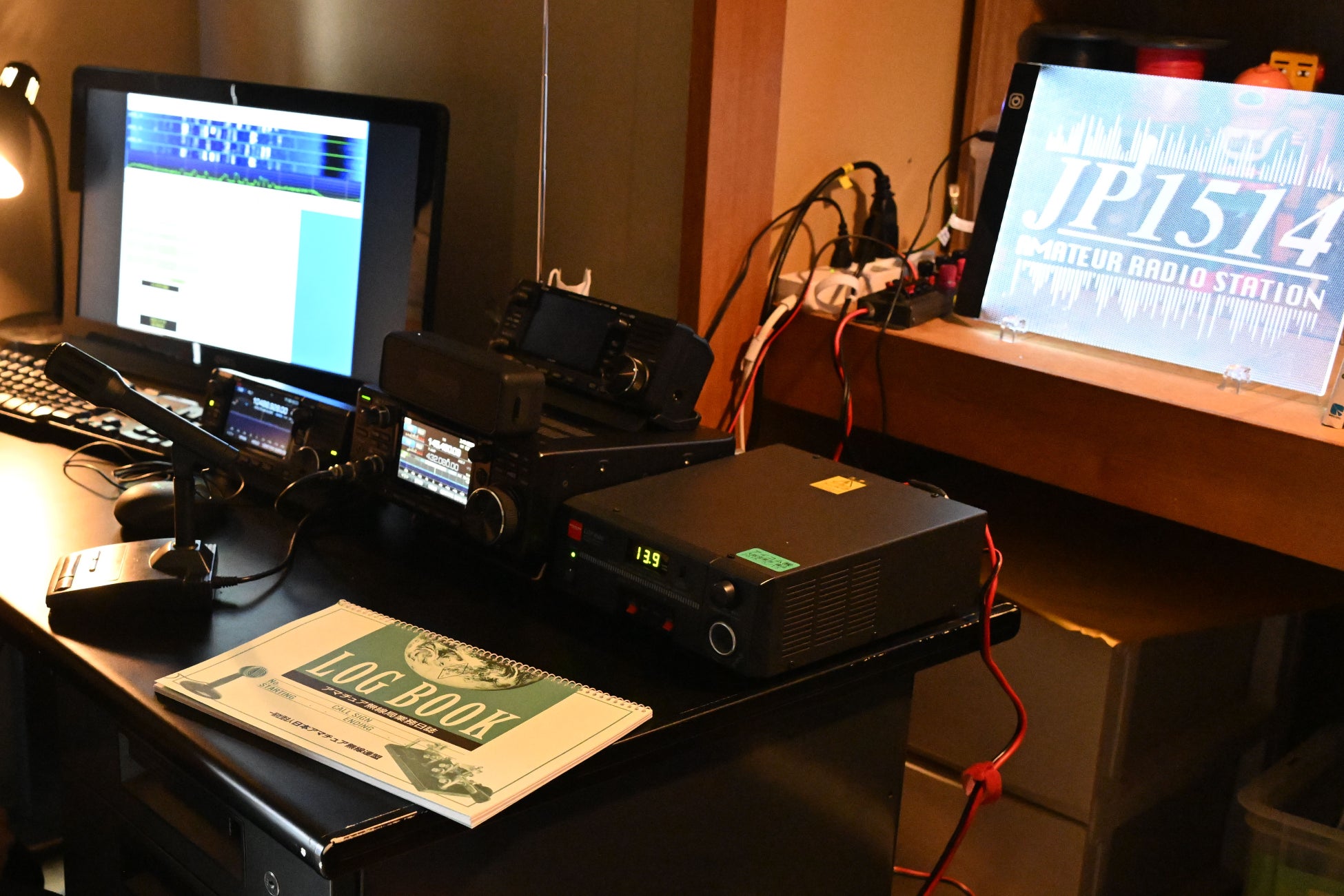 ハム青年の部屋、卓上にはアマチュア無線機「IC-905」や交信記録をつけるログブック、デスクの後ろにはコールサイン風の英数字を記したプレートも。