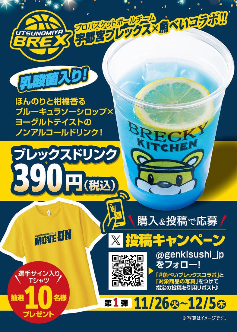11月26日(火)より対象の魚べい店舗にて、「魚べい×ブレックス オリジナルドリンク」を販売します。また抽選で10名にブレックス選手サイン入りTシャツが当たるキャンペーンも実施します!
