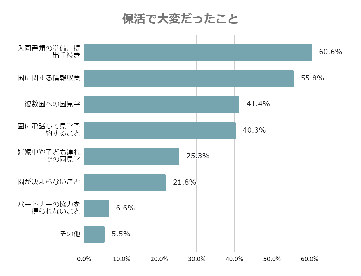 他にも、見学のために足を運ぶことや、その予約のために電話することにもハードルを感じている保護者が多くいます。また、「パートナーの協力が得られないこと」と回答した保護者も6.6%おり、協力して保活を行うことの必要性が窺えます。