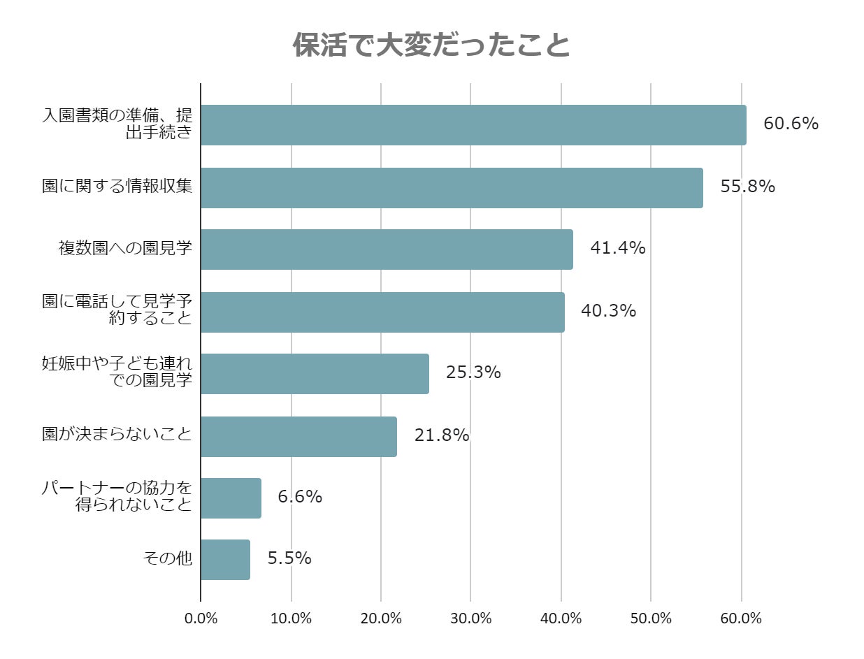 大変だった保活の中でも、何が大変だったかを質問した結果(複数選択可)、「入園書類の準備、提出手続き」と答えた保護者が60.6%、「園に関する情報収集」と答えた保護者が55.8%と半数以上の保護者がその複雑さに頭を抱えていたことがわかりました。