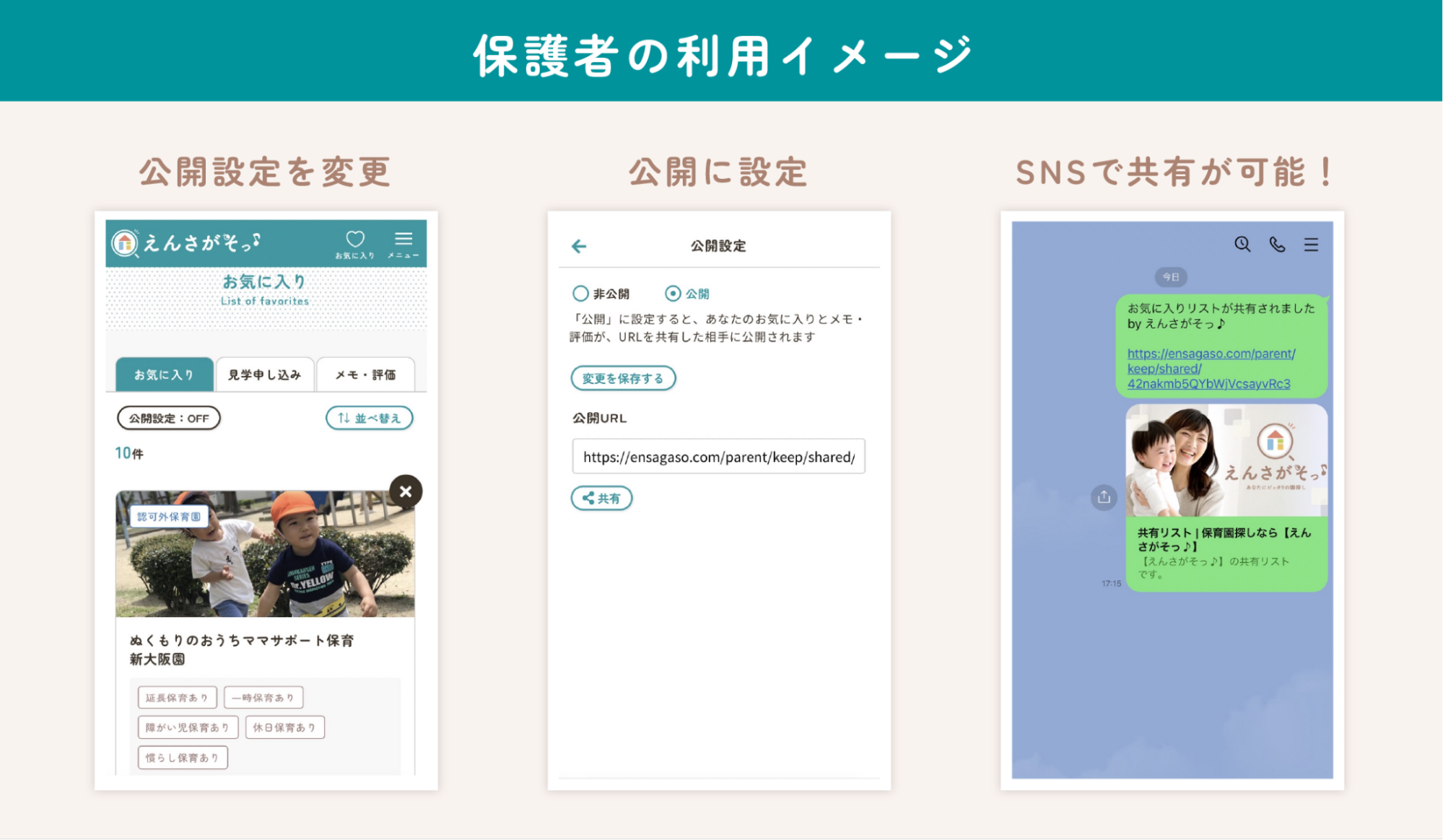 当社は”夫婦で保活”を推進するために、「えんさがそっ♪」内でお気に入り登録した保育施設や記録したメモが他人と共有できるリスト共有機能をリリース致しました。共有機能を使うことで、パートナーの検討している保育施設や、その施設に対するコメントを簡単に共有し、夫婦で協力して保活を行うことがよりスムーズになります。