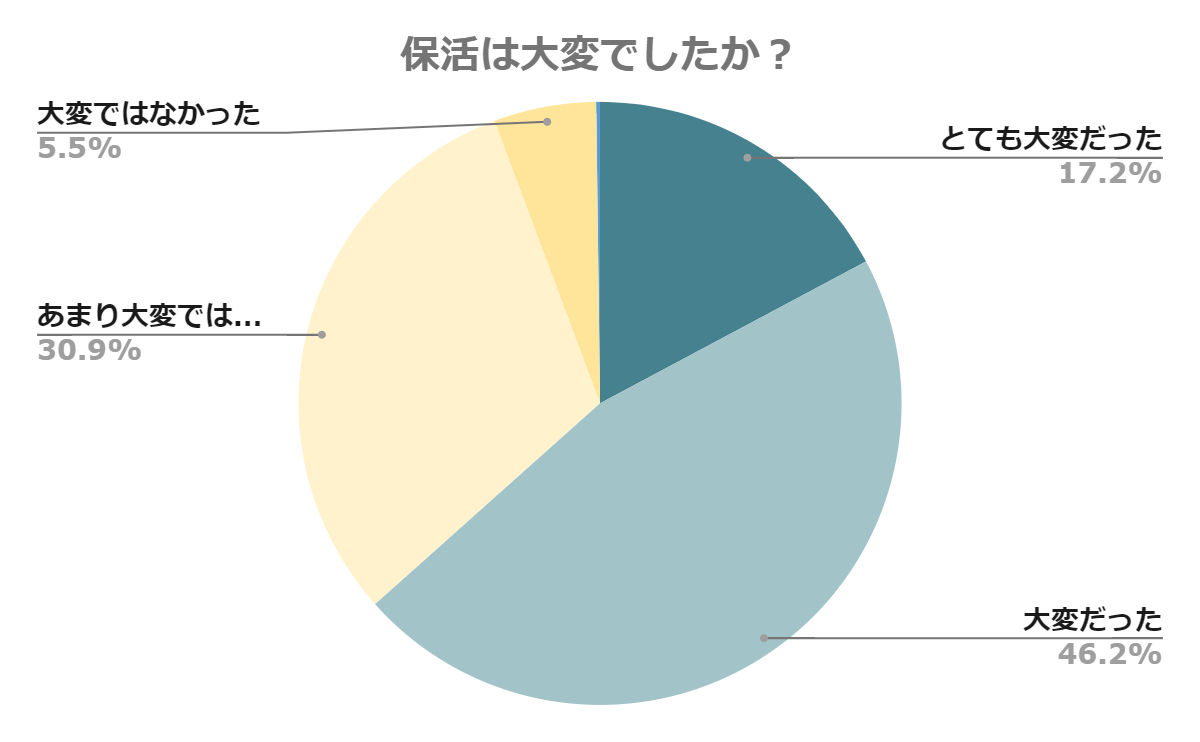 保活は大変だったか、という質問に対し、63.4%もの保護者が「大変だった」と回答しています(「とても大変だった」と「大変だった」の合計)。この結果から、保活は決して母親1人に任せるものではなく、2人で協力して行うべきであるといえます。