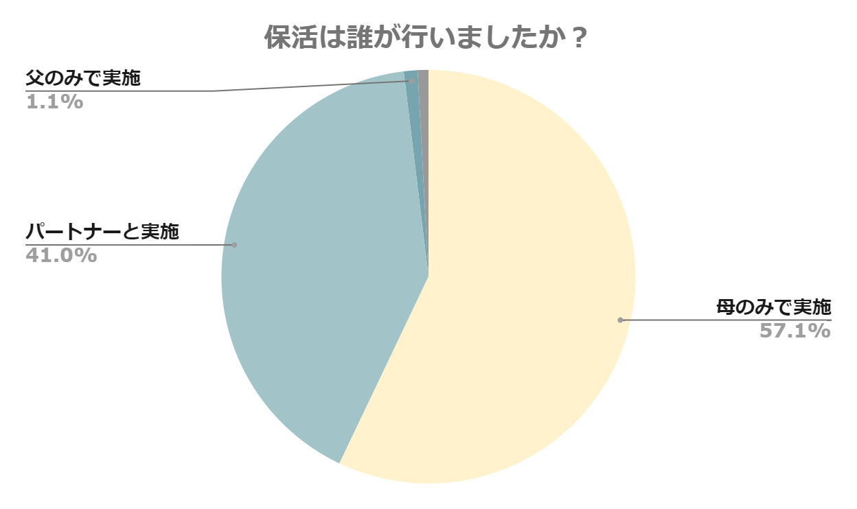 誰が保活を行ったか、という質問に対し、「母が実施した」と回答した割合が6割近くにも上っています。一方で、パートナーと実施した割合は4割程度であり、父が実施した家庭はわずか1%でした。この結果から、「保活」は母中心に行う傾向にあり、父の協力が乏しいことが明らかになりました。