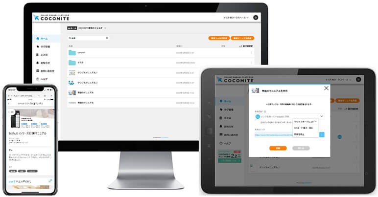 「COCOMITE」は、オンライン上でマニュアルの作成から活用、管理、改善までを運用できるプラットフォームサービスです。画像や動画を用いた見やすくわかりやすいマニュアルが、誰でも簡単に作成できることが大きな特徴です。PCだけではなく、タブレットやモバイル端末からの閲覧も可能なため、社内外問わずどこからでもマニュアルにアクセスすることが可能です。