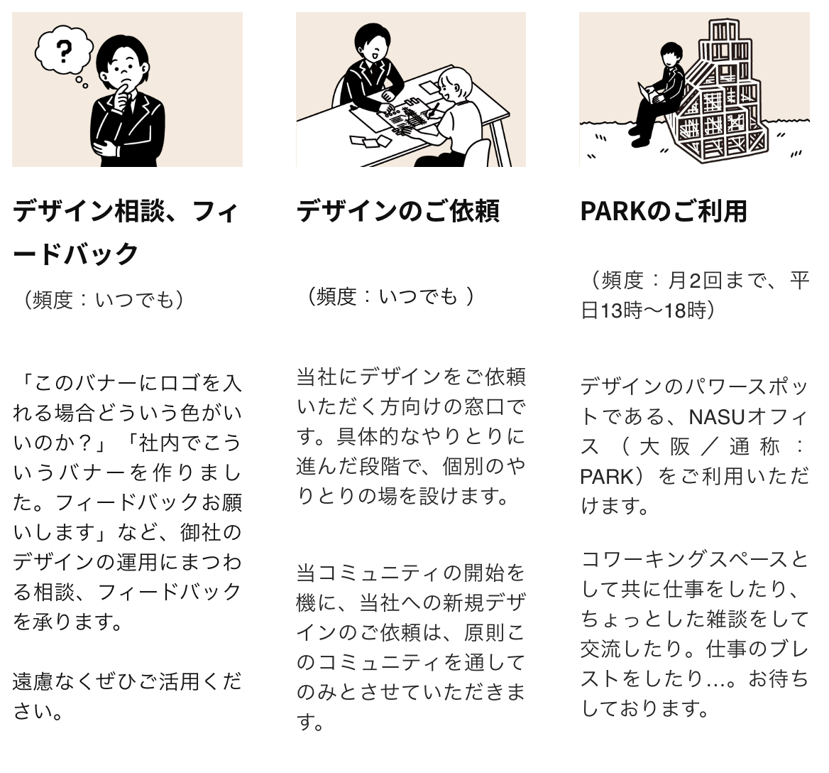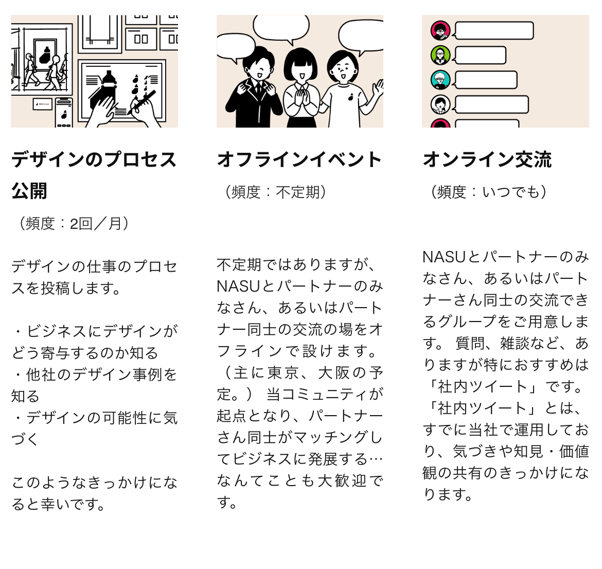NASUが「勝てるデザイン」をご提供するためには、NASUとクライアント様の価値観の相互理解が不可欠です。そこで、このコミュニティを通して、お互いの会社の価値観をすり合わせていきたいと考えております。「会社案内型」コミュニティと言っているのはこのためです。