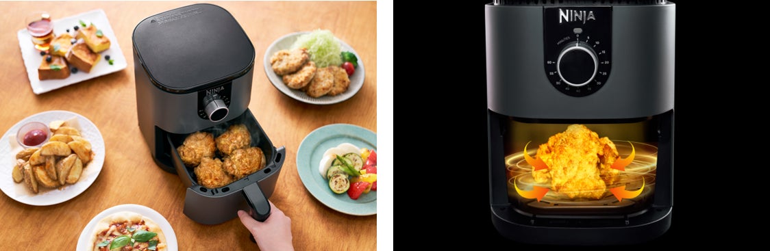 「Ninja® ミニエアフライヤー」は、ダイヤルを回すだけの簡単な操作で、強力熱風が食材を包み込み、外はカリッと、中はジューシーな仕上がりを実現します。
