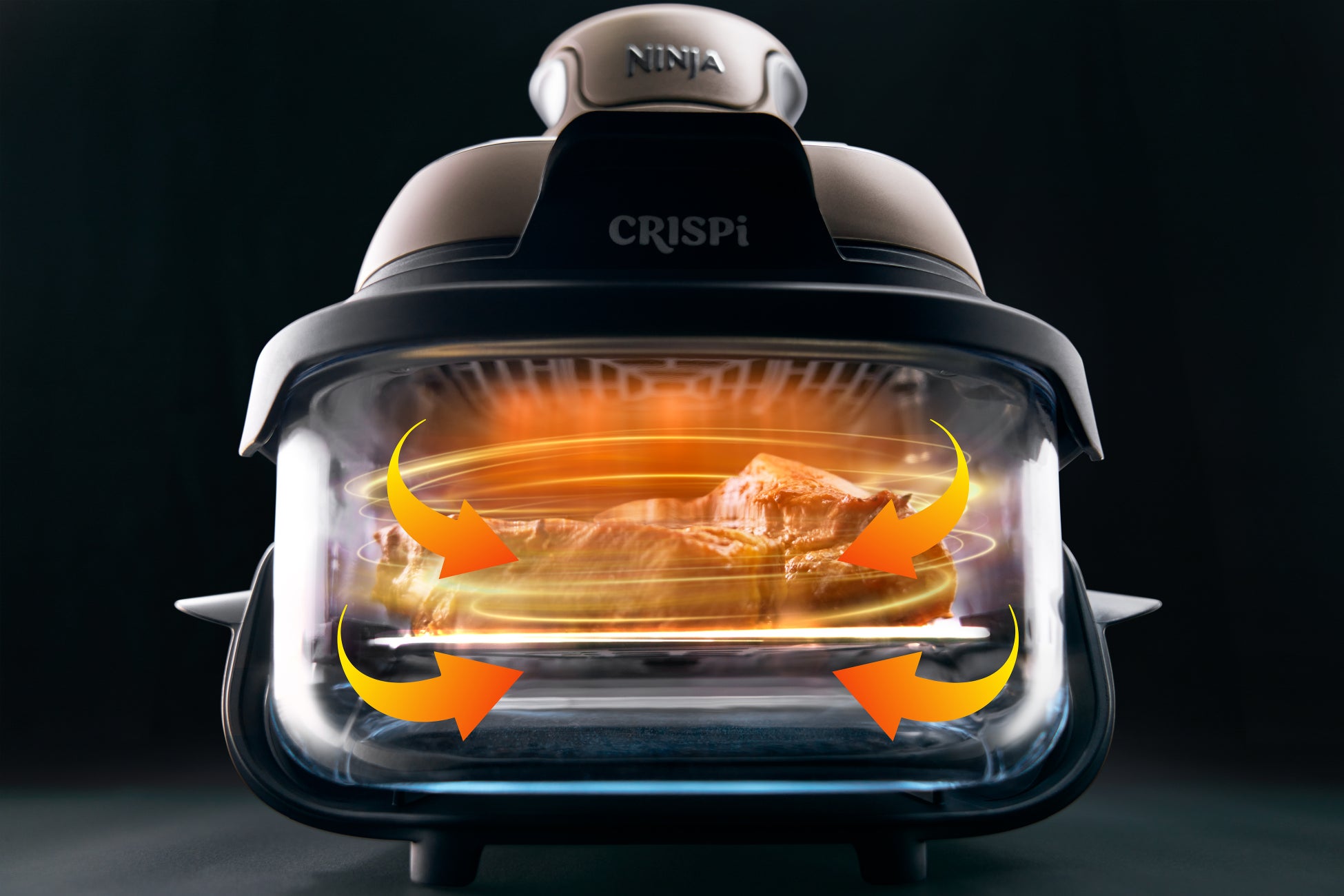 「Ninja Crispi テーブルクッカー」は、ガラスコンテナに食材を入れて「下ごしらえ、加熱調理、サーブ、保存、温め直し」までが一台で完結できる、新感覚のテーブルクッカーです。強力熱風ファン、高火力ヒーター、高熱伝導プレートの組み合わせにより、ジューシーで本格的な仕上がりを実現します。