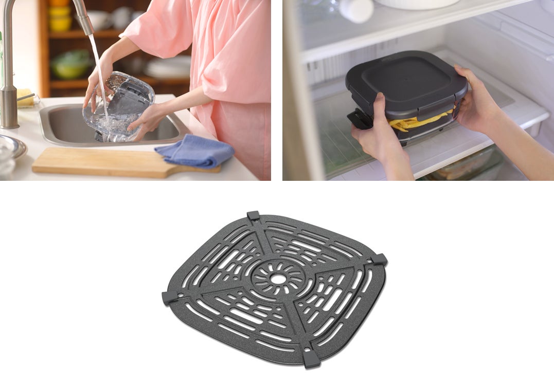 大型の「強力熱風ファン」、1,400Wの「高火力ヒーター」、アルミニウム製の「高熱伝導プレート」による3つの熱伝導によって食材を包み込むように熱が広がることで、ジューシーで本格的な仕上がりを実現します。またガスや火を使わなくてもグリル調理、焼き魚、ヘルシーな揚げ物などの調理ができるため、誰でも安心して料理を楽しむことができます。
