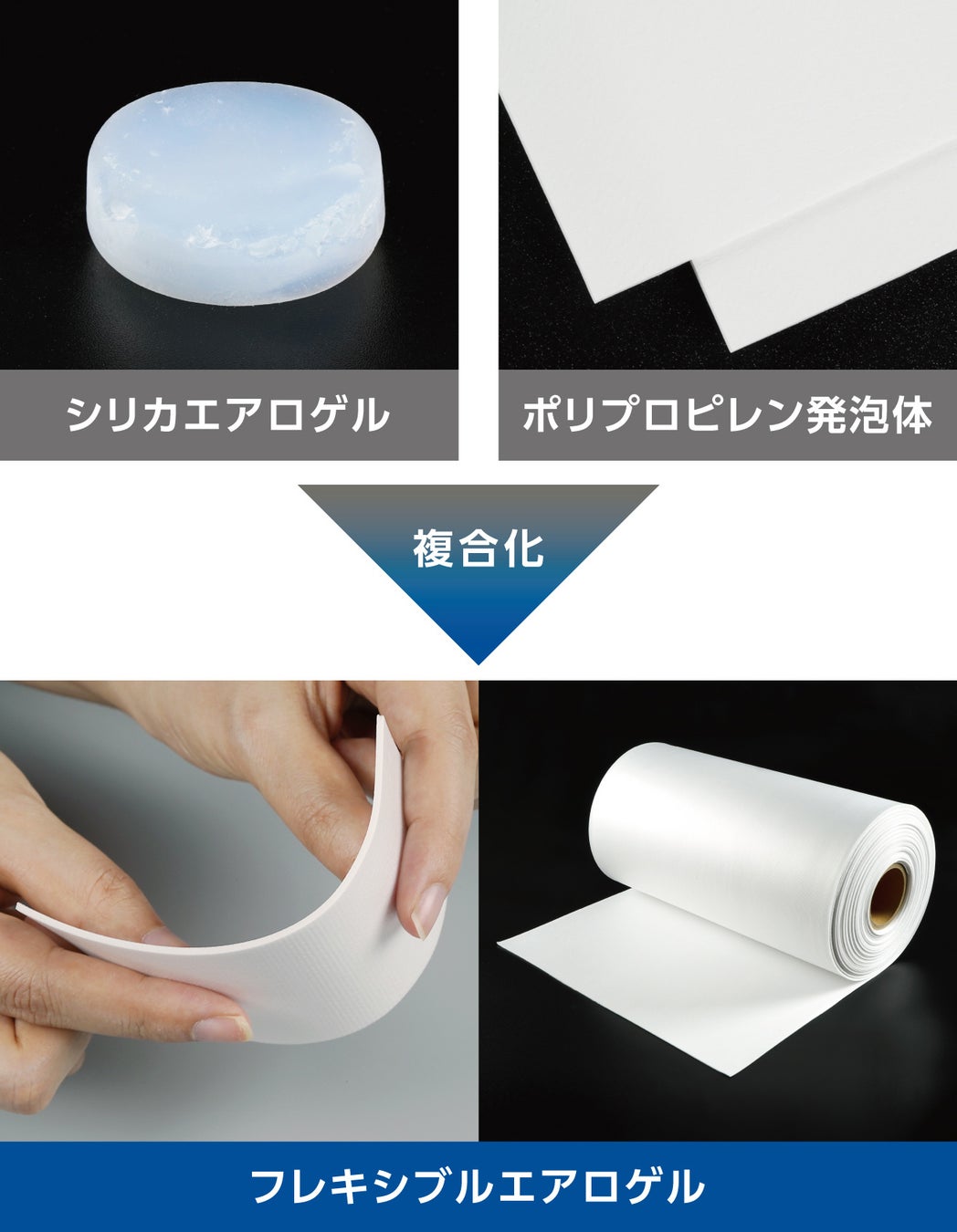 NEDOが主導する本プログラムにおいて、産総研とITCは微細な気泡構造を有するポリプロピレン発泡体と、断熱性に優れるシリカエアロゲルを複合化した高性能断熱シート「フレキシブルエアロゲル」を開発いたしました。