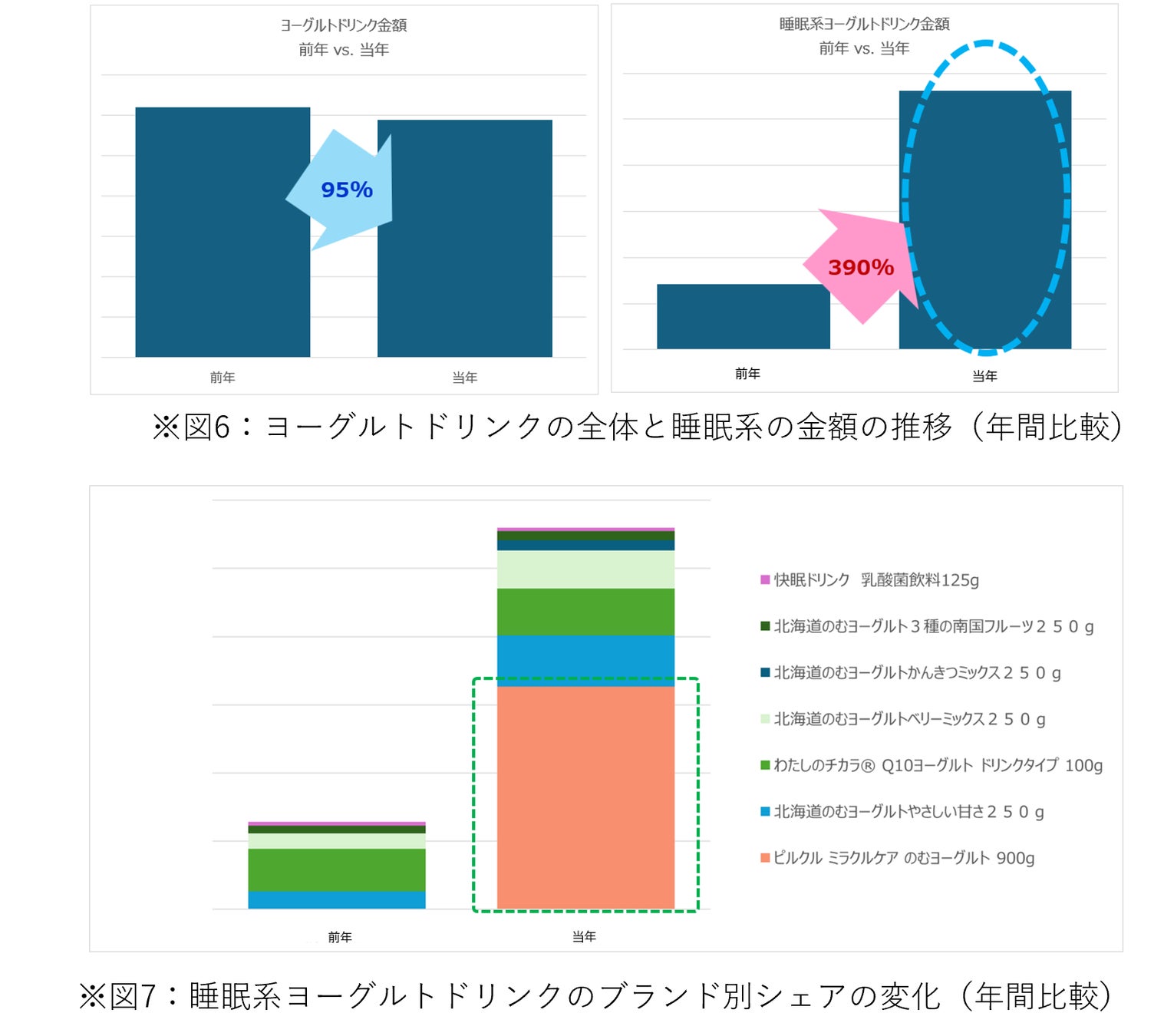 ヨーグルトドリンクのカテゴリは市場全体としては前年比95% (金額ベース、図6)となっておりやや不調とも取れる一方、睡眠系に限ったヨーグルトドリンクは前年比390%の成長となっている。「睡眠改善」が、成熟を迎えたかのように感じられたカテゴリに新たな成長兆しをもたらす可能性が見て取れる。