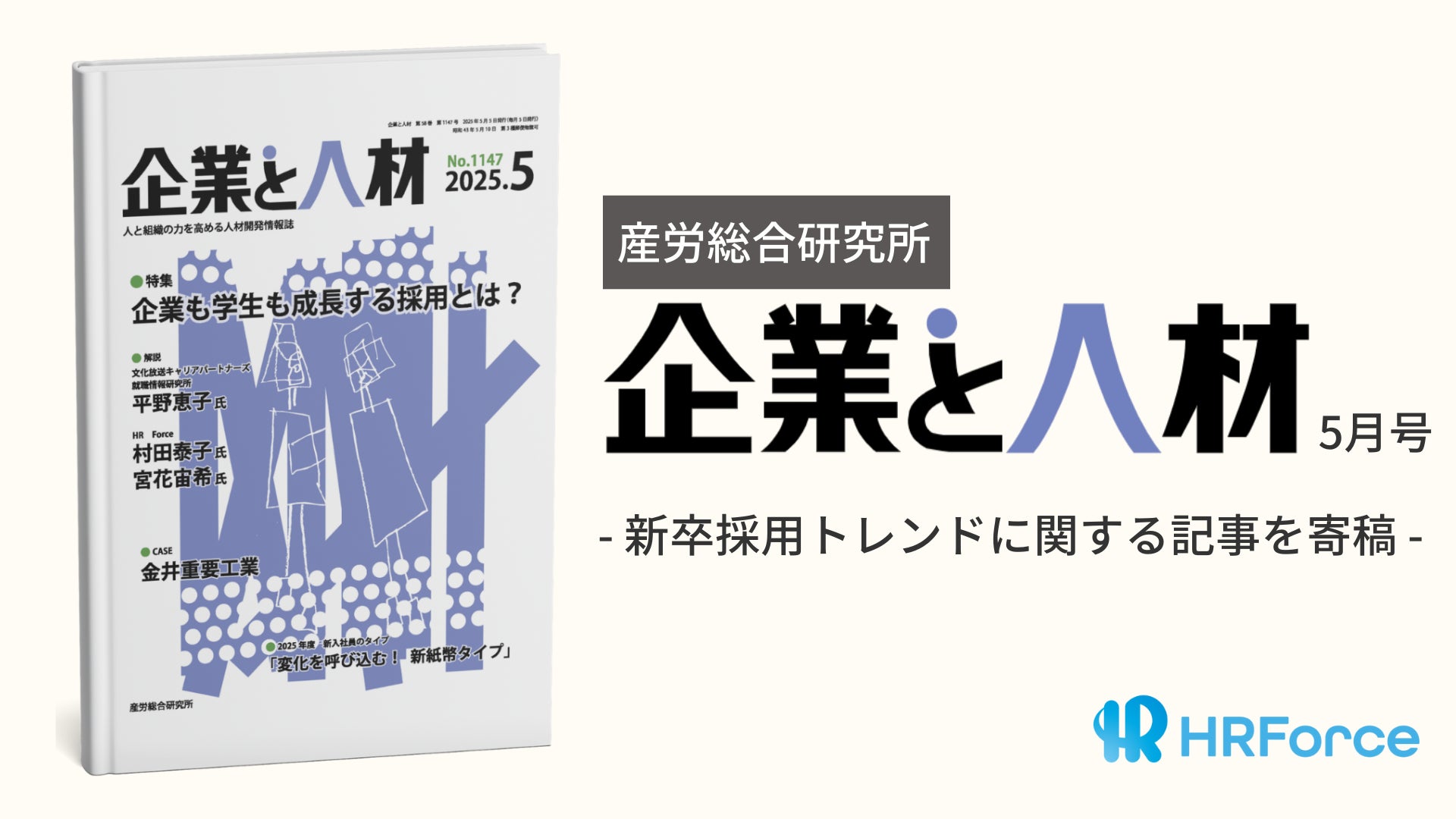 株式会社HR Force(本社:東京都中央区 代表取締役:村田 泰子)の代表取締役 村田泰子、取締役 宮花 宙希が、株式会社産労総合研究所が発行する専門誌『企業と人材』2025年5月号へ、新卒採用の最新トレンドに関する記事が掲載される運びとなりましたので、お知らせいたします。