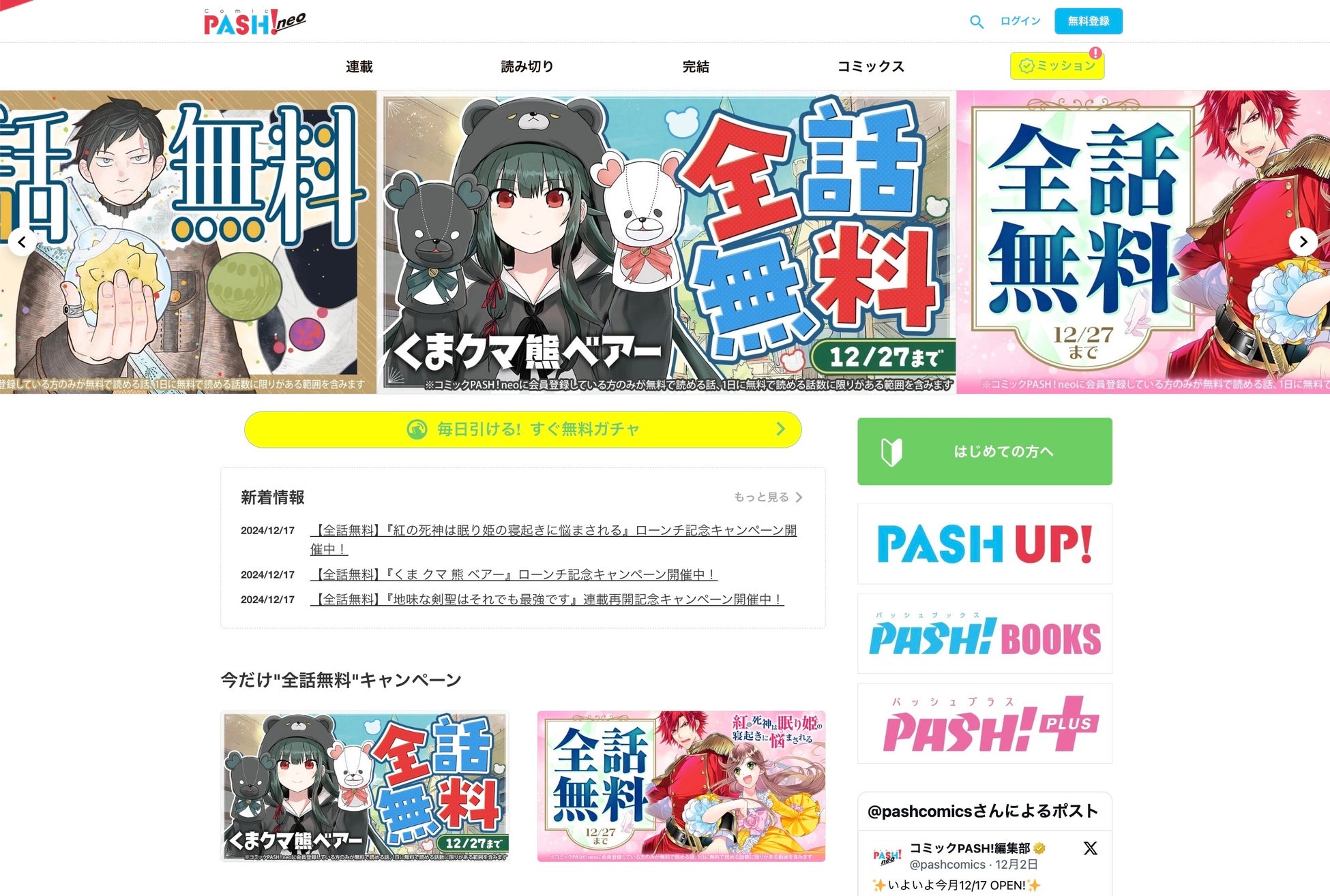 『くま クマ 熊 ベアー』、『神統記(テオゴニア)』、『妃教育から逃げたい私』『イケナイ教』の「コミックPASH! neo」リニューアル!システムは「コミチ+」!