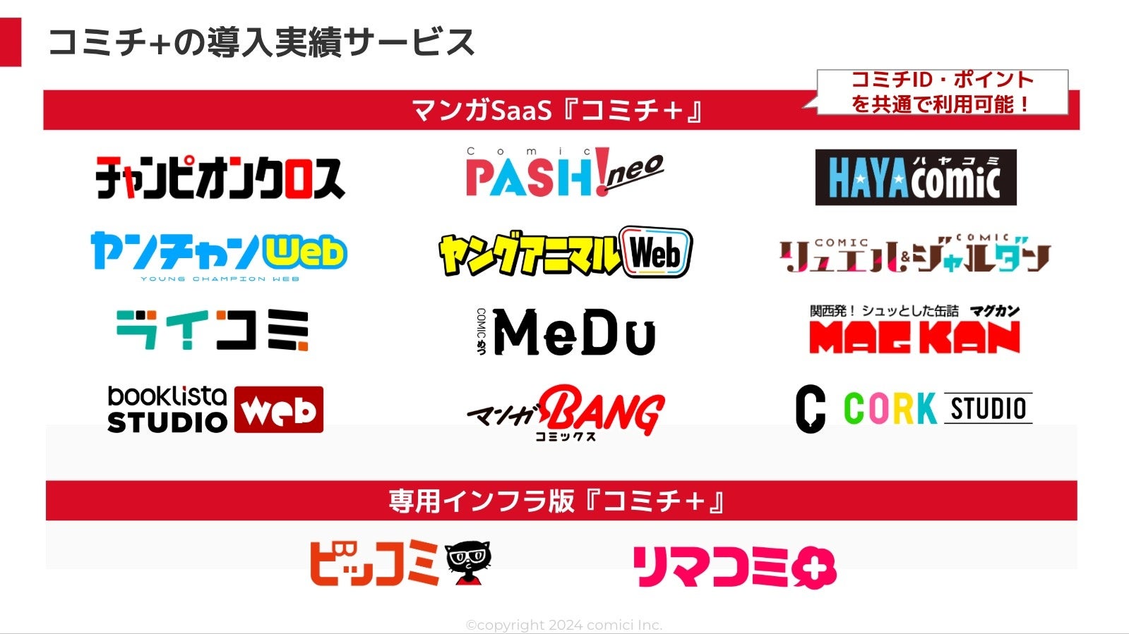 秋田書店「チャンピオンクロス」「ヤンチャンWeb」、白泉社「ヤングアニマルWeb」、小学館「ビッコミ」(専用インフラ版) 、集英社「リマコミ+」(専用インフラ版)など、出版社のWebマンガ誌のインフラを担っています。