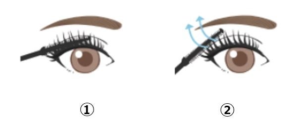 ①コームの短い面をまつ毛の根元に当て、グッと持ち上げるように塗る。
